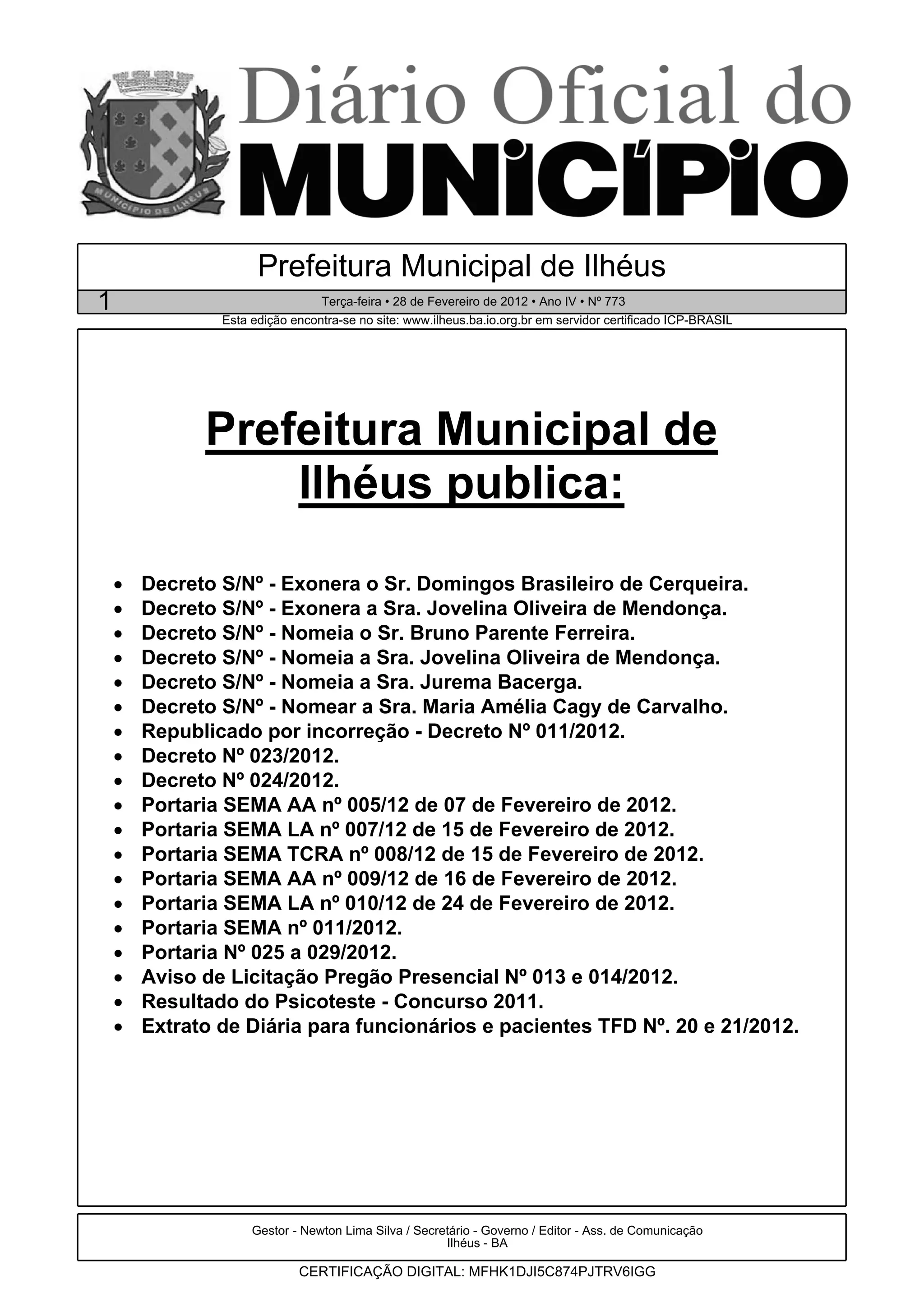 Este documento relata três decretos publicados pela Prefeitura Municipal de Ilhéus em 28 de fevereiro de 2012. Em um decreto, Bruno Parente Ferreira é nomeado para o cargo de Chefe de Segurança do Gabinete do Prefeito. Um segundo decreto nomeia Jovelina Oliveira de Mendonça para o cargo de Diretora Pedagógica da Escola Municipal Gisélia Soares. Um terceiro decreto nomeia Otavio Augustus Carmo, Ana Paula Castro Barreto e Angela Lima de Jesus Alves para compor a Comissão Permanente de
