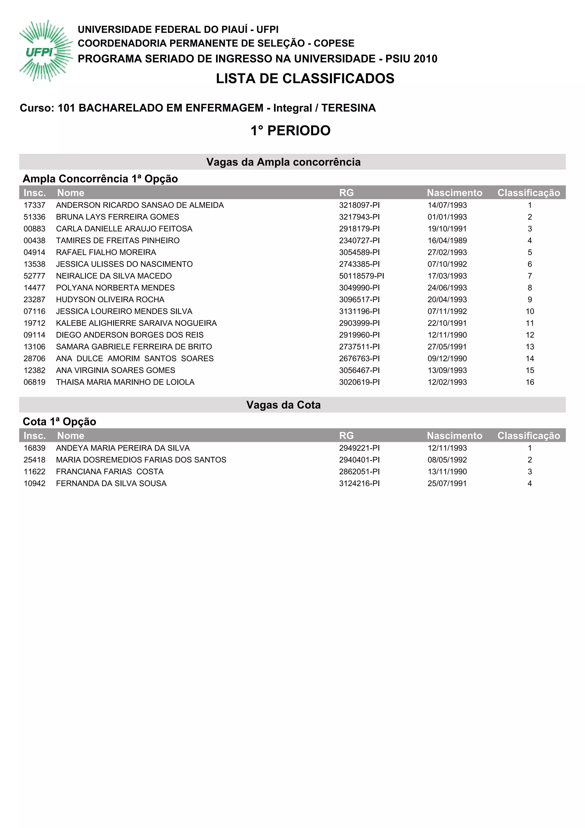 O documento apresenta listas de classificação de estudantes aprovados no Programa Seriado de Ingresso na Universidade (PSIU) 2010 para os cursos de Enfermagem, Farmácia e Medicina na Universidade Federal do Piauí (UFPI). As listas contêm o nome, RG, data de nascimento e classificação dos estudantes aprovados nos 1o e 2o períodos dos cursos, separados entre vagas da ampla concorrência e da cota.