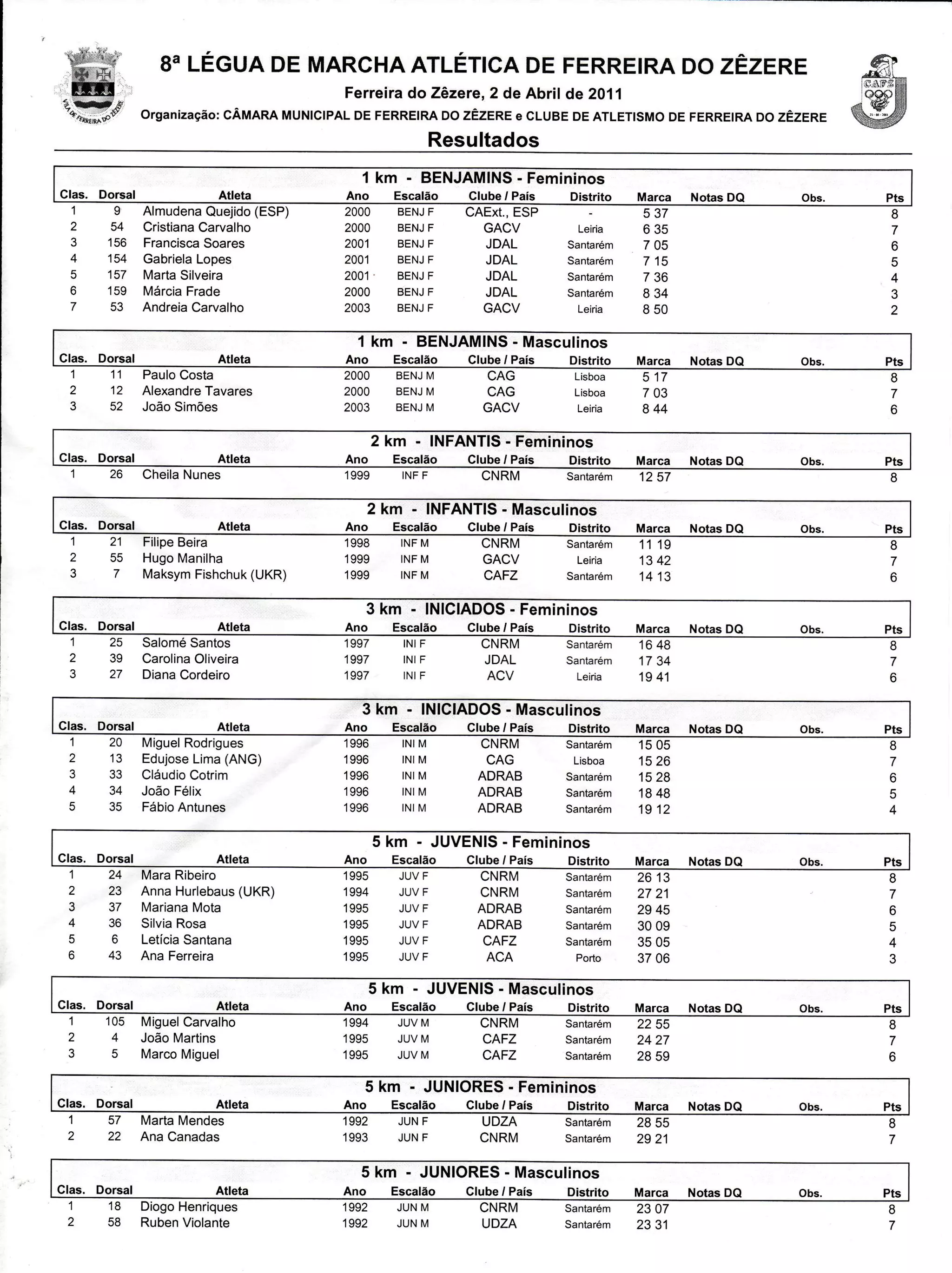 Este documento apresenta os resultados de uma competição de atletismo realizada em Ferreira do Zêzere, Portugal. Os resultados incluem as classificações e marcas de vários atletas em diferentes categorias como benjamins, infantis, iniciados, juvenis e juniores. As categorias competiram em distâncias que variaram entre 1km e 5km. O documento fornece detalhes como nome, ano de nascimento, clube e marca de cada atleta.