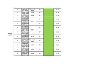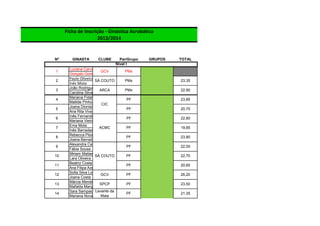 1) O documento apresenta uma lista de ginastas divididos por nível, escalão, clube e grupo.