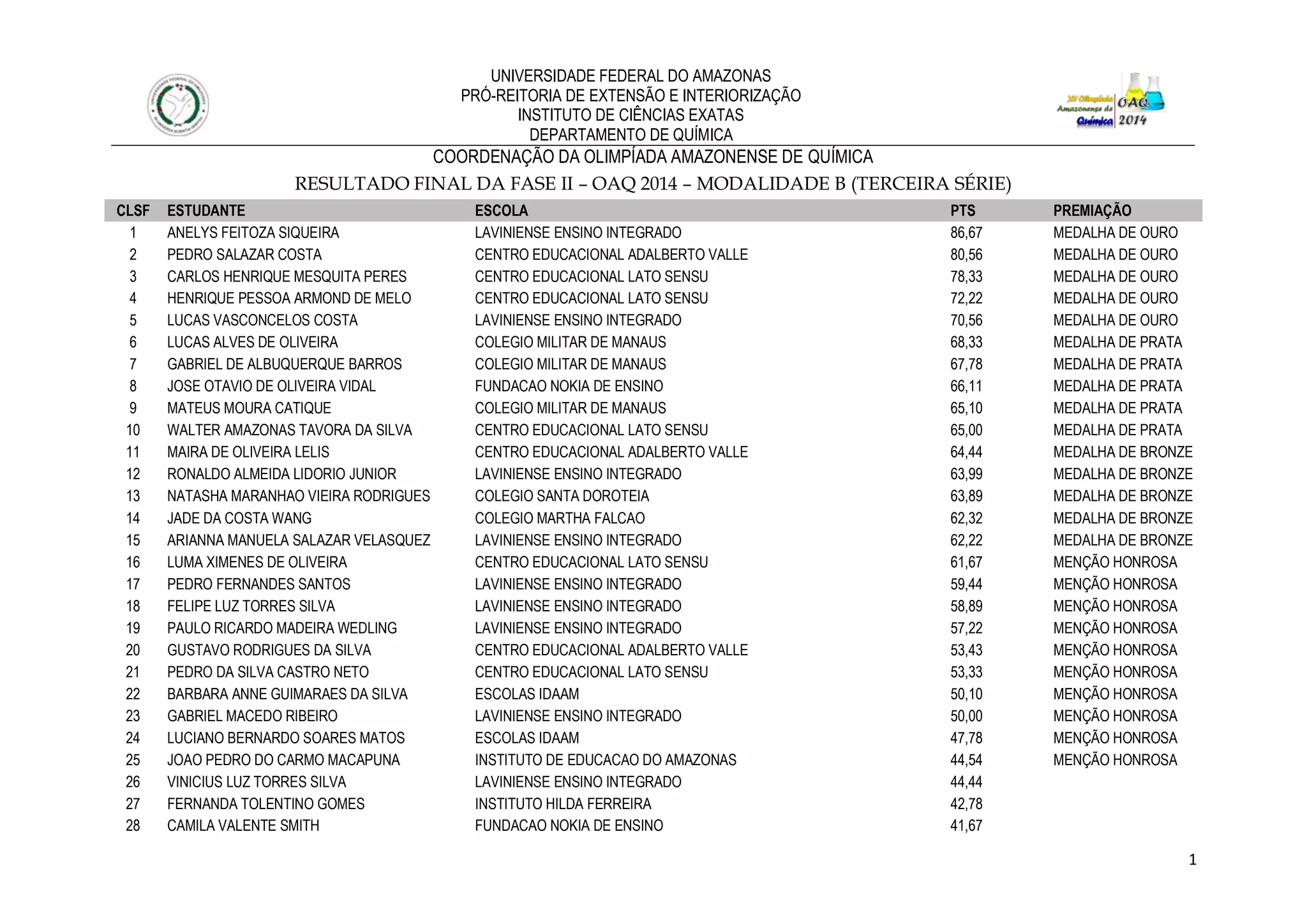 O documento apresenta os resultados finais da fase II da Olimpíada Amazonense de Química 2014, modalidade B, para estudantes da terceira série do ensino médio. Os estudantes são classificados com base nas suas pontuações, recebendo medalhas de ouro, prata, bronze e menções honrosas. A lista inclui estudantes de diversas escolas, com destaque para os que alcançaram as melhores pontuações.