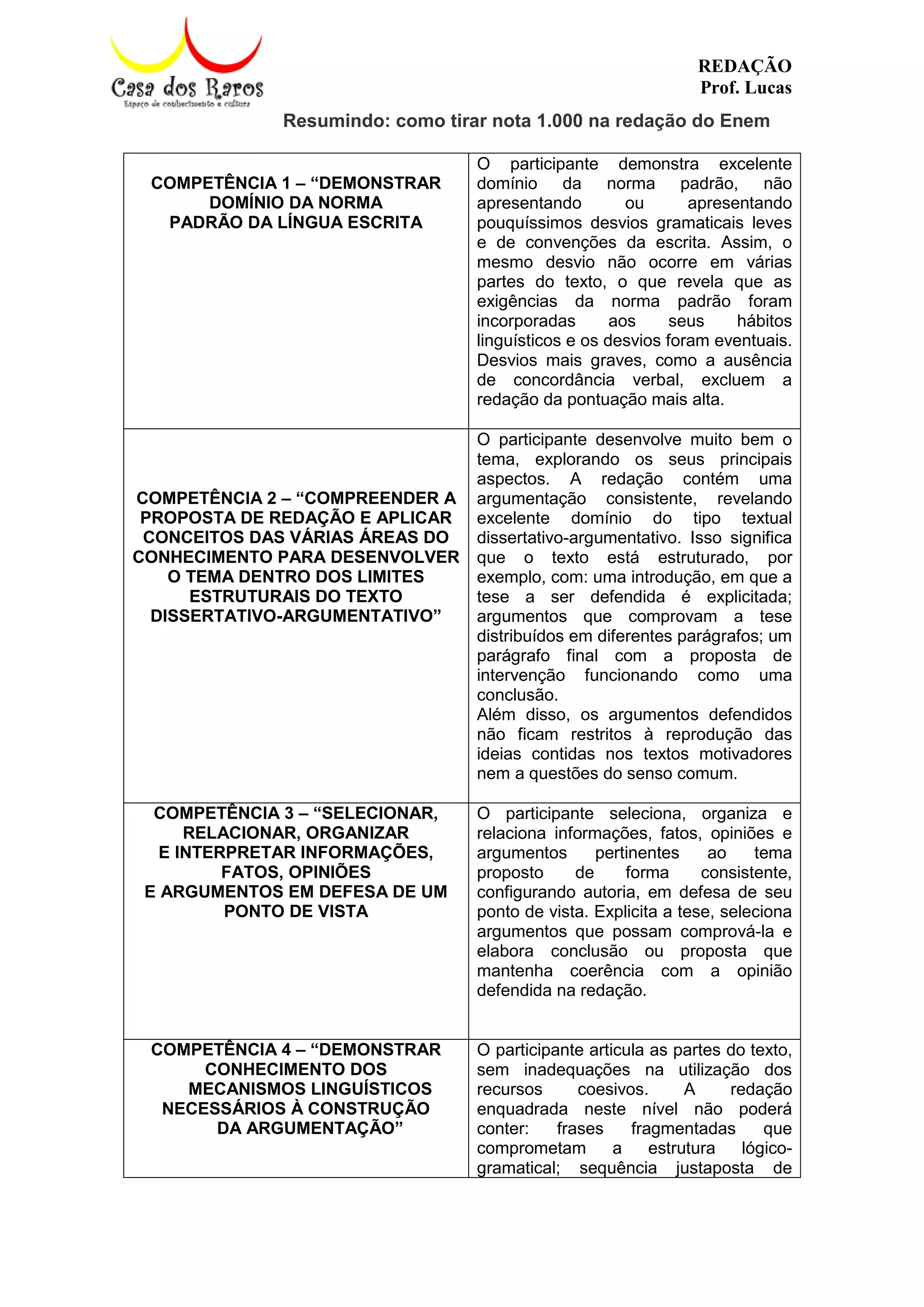 O documento discute as competências necessárias para obter nota máxima na redação do ENEM, incluindo: demonstrar domínio da norma padrão da língua portuguesa, compreender a proposta de redação e aplicar conceitos de diferentes áreas do conhecimento para desenvolver o tema dentro dos limites estruturais do texto dissertativo-argumentativo, selecionar, relacionar, organizar e interpretar informações para defender um ponto de vista, demonstrar conhecimento dos mecanismos linguísticos necessários para construir a argumentação, e elabor