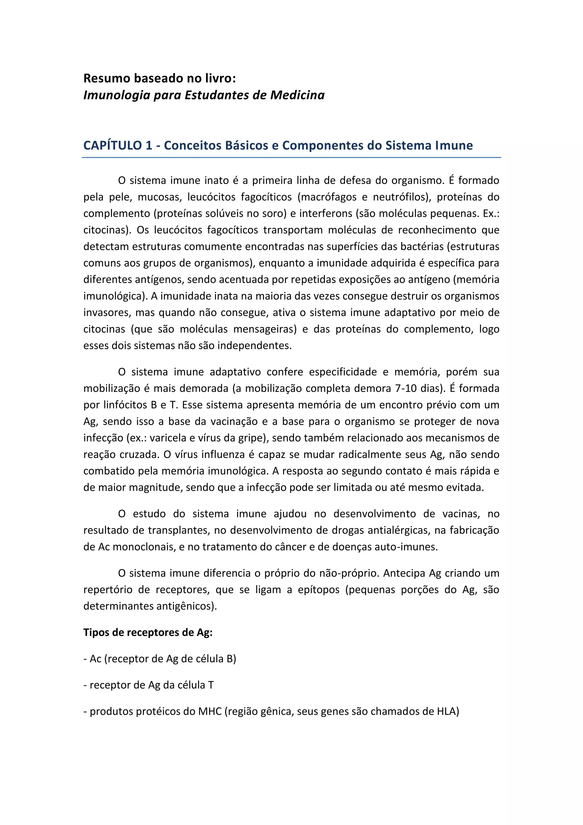 O documento resume os principais conceitos sobre o sistema imune. O sistema imune é dividido em inato e adaptativo. O sistema inato é a primeira linha de defesa e inclui células e moléculas que reconhecem patógenos de forma inespecífica. O sistema adaptativo confere especificidade e memória e é mediado pelos linfócitos B e T.