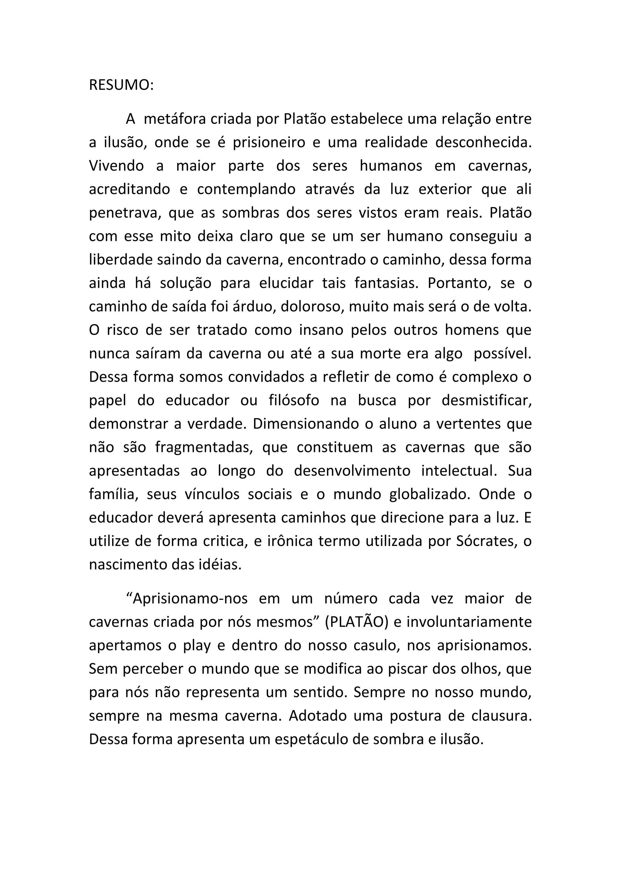 O documento discute a Alegoria da Caverna de Platão, na qual os seres humanos vivem presos a uma caverna e acreditam que as sombras que vêem são reais. O documento também alerta sobre os perigos de ficarmos presos em nossas próprias "cavernas", como a indiferença, e defende a importância de buscarmos a verdade e nos libertarmos dessas ilusões.