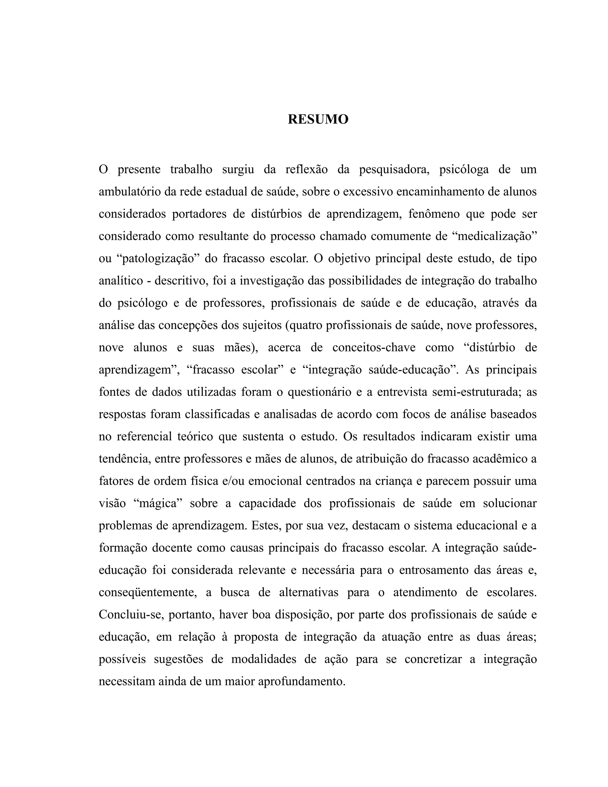 2) Foi investigada a visão de professores, alunos, mães e profissionais de saúde sobre distúrbios de aprendizagem, fracasso escolar e integração saúde-educação.