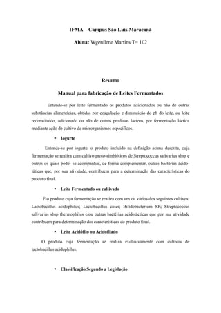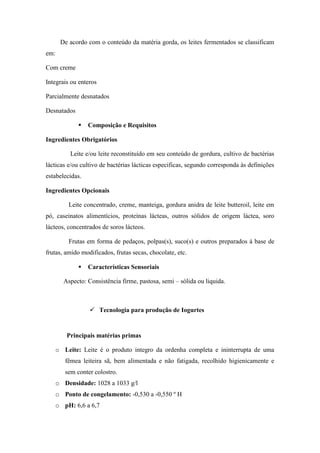 O documento fornece instruções sobre a fabricação de leites fermentados, incluindo iogurte, leite fermentado e leite acidófilo. Detalha os processos de produção, incluindo matérias-primas, tratamento térmico, adição de culturas lácteas e fermentação. Também fornece informações sobre a fabricação de doces de leite pastosos e em tabletes.