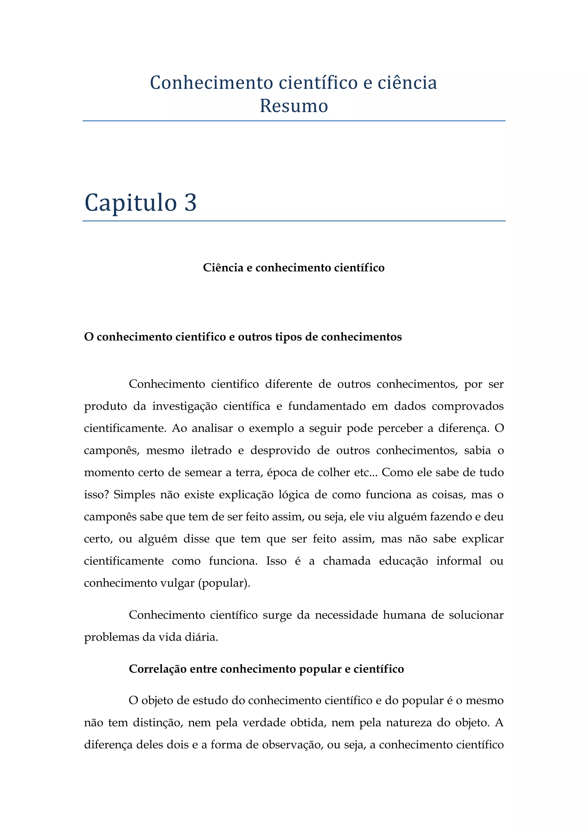 O documento discute diferentes tipos de conhecimento, incluindo conhecimento científico, popular, filosófico e religioso. Ele descreve que o conhecimento científico é sistemático, verificável e aproximadamente exato, enquanto o conhecimento popular é subjetivo e inexato. Também discute as características do positivismo, materialismo dialético e método dialético.