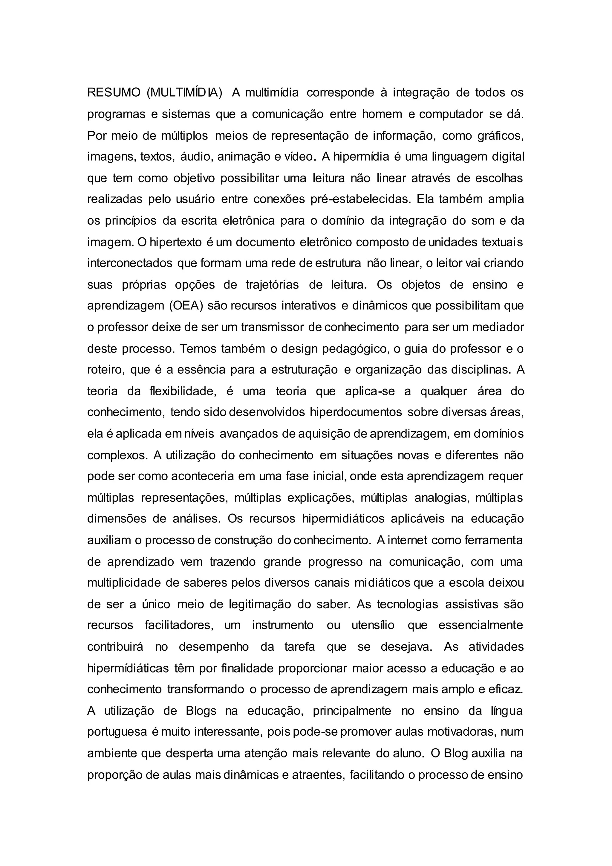 Multimídia integra diferentes meios de comunicação como imagens, texto e áudio para permitir aprendizagem não linear. Hipermídia expande escrita eletrônica para integrar som e imagem. Blogs podem promover aulas motivadoras de língua portuguesa ao permitir discussões públicas e feedback entre alunos e professores.