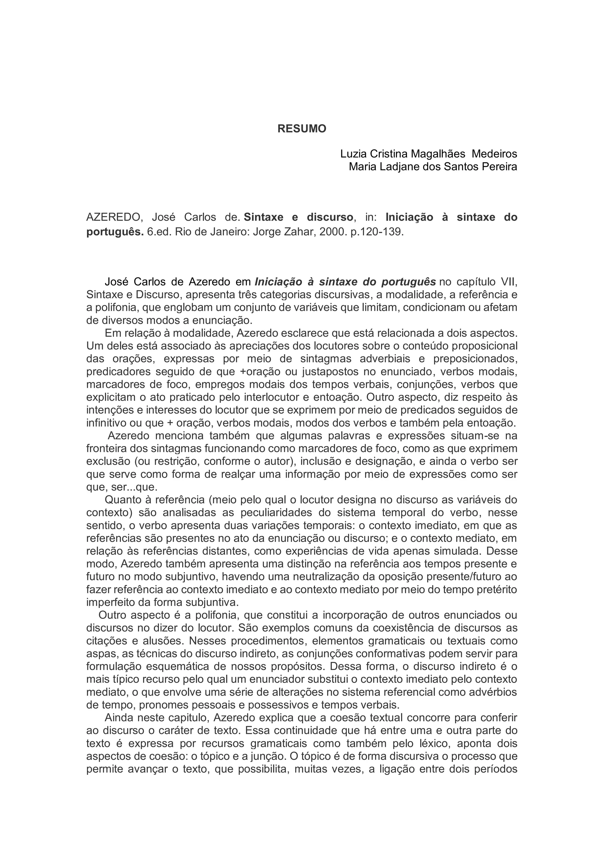 No capítulo sobre sintaxe e discurso, Azeredo apresenta três categorias discursivas: modalidade, referência e polifonia. Ele explica como esses aspectos são expressos gramaticalmente e afetam a enunciação. Azeredo também discute a coesão textual e como recursos gramaticais e léxicos conferem continuidade ao discurso.