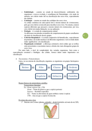 O documento descreve os principais sistemas de classificação dos seres vivos, incluindo os reinos propostos por Whittaker (Monera, Protista, Fungi, Plantae e Animalia). Detalha os critérios usados na classificação, como a morfologia, embriologia, bioquímica e nutrição. Fornece também características gerais sobre cada um dos cinco reinos propostos por Whittaker.