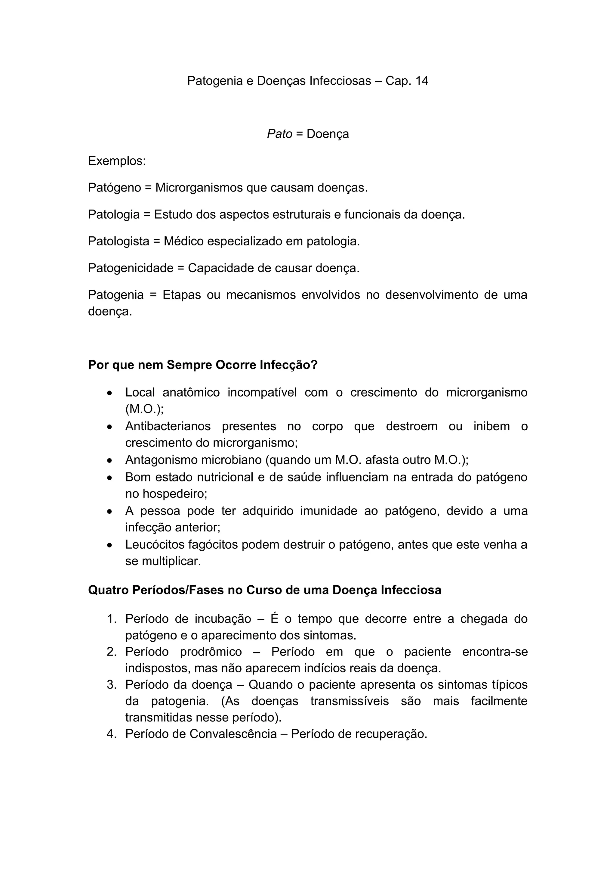 O documento discute conceitos-chave de patogenia e doenças infecciosas, incluindo: (1) definições de termos como patógeno, patologia e patogenicidade; (2) as etapas no desenvolvimento de uma doença infecciosa; e (3) fatores que influenciam se uma infecção ocorre ou não após a entrada de um patógeno no corpo.