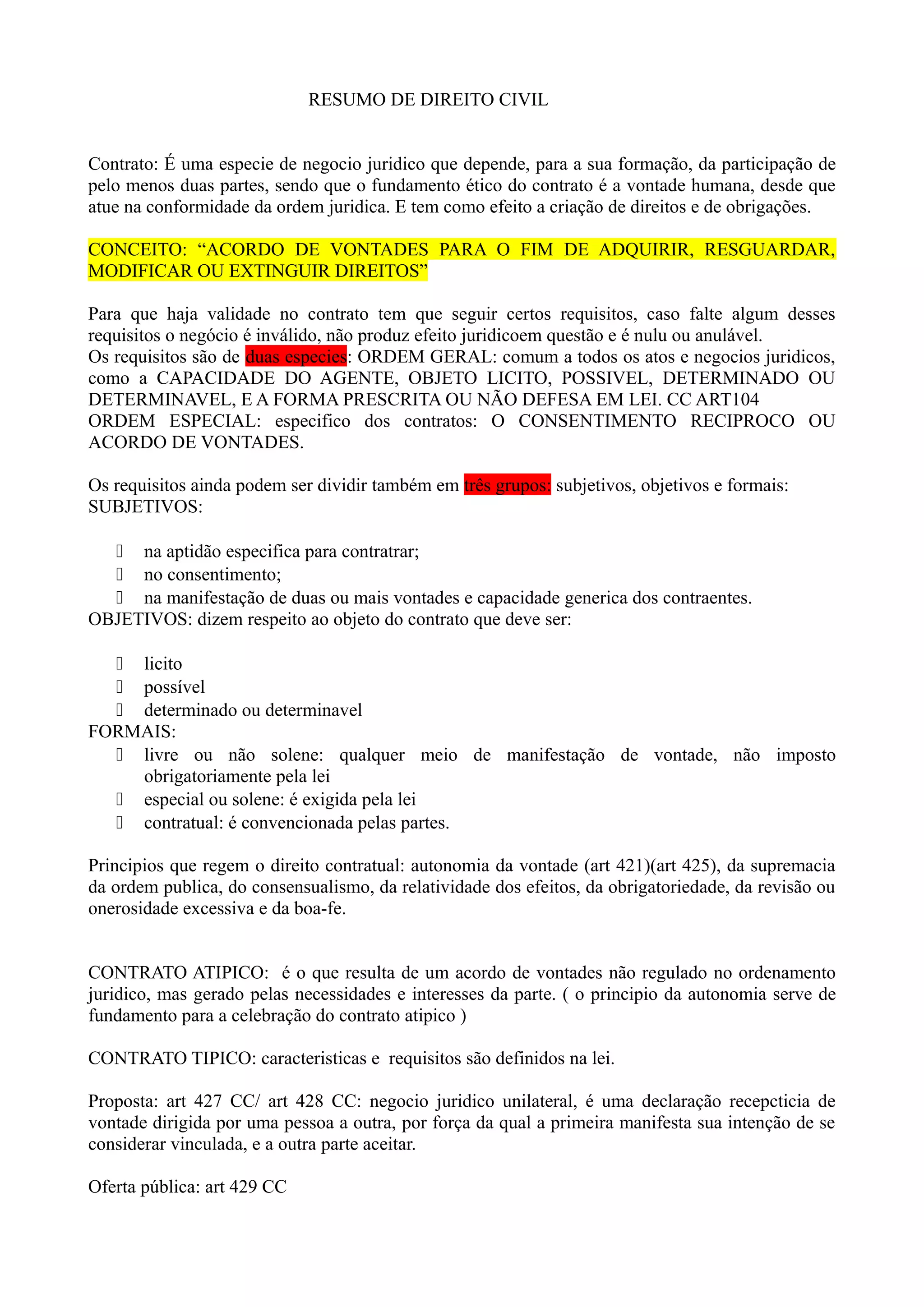 3) Existem contratos típicos, cujas características são definidas em lei, e atípicos, resultantes de acordos não regulados mas gerados por necessidades e interesses das partes.