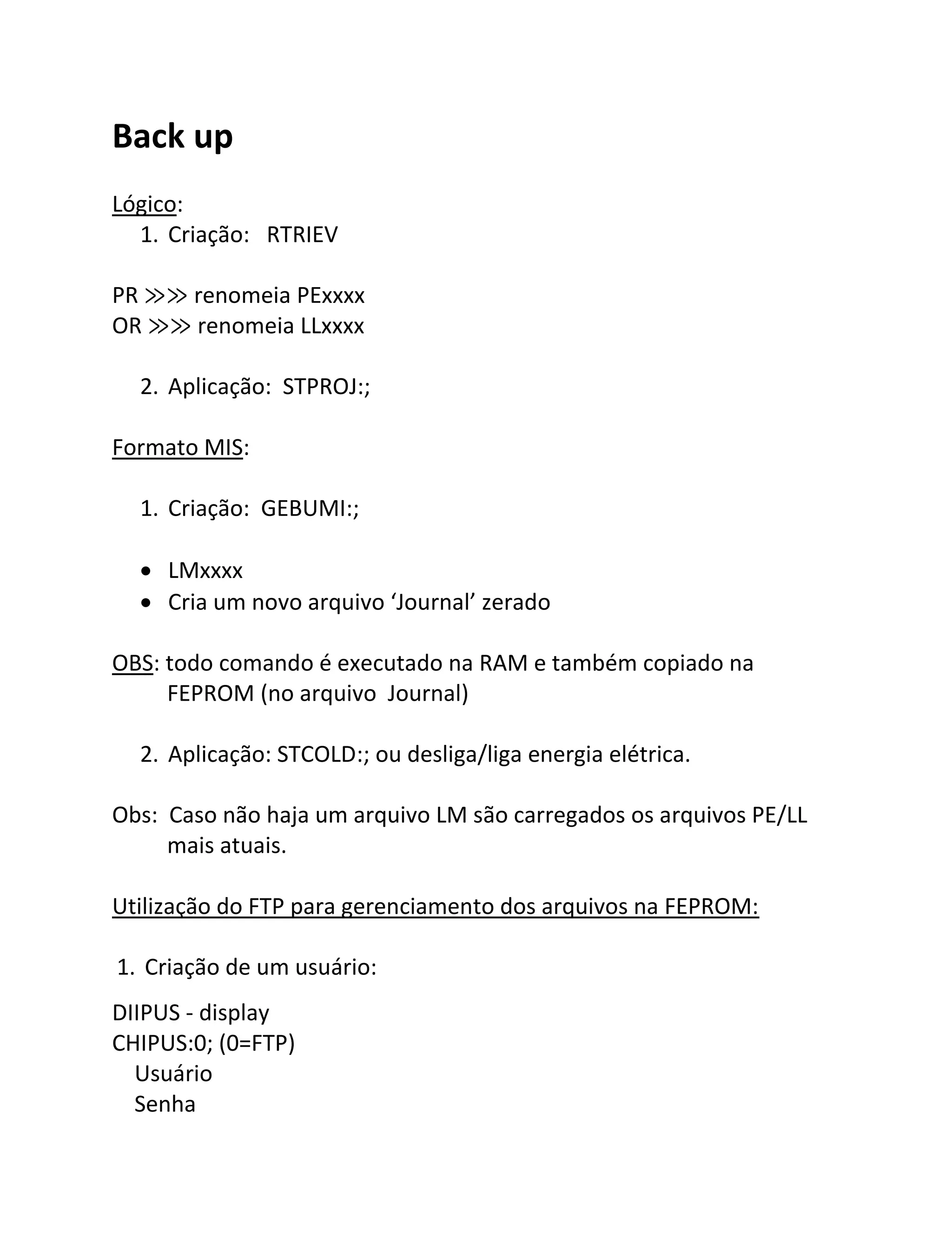 1) O documento descreve os procedimentos para realizar backups lógicos e de formato MIS na memória não volátil de um sistema, incluindo a criação e aplicação dos backups.