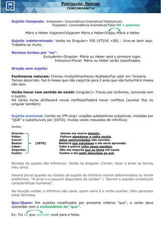 2) Regras para sujeitos compostos, indeterminados e unidos por "ou" são explicadas.