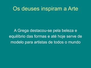 A arte grega destacou-se pela beleza e equilíbrio das formas, inspiradas pelos deuses. Os templos gregos eram harmônicos e proporcionais, construídos com pedra e mármore. A escultura evoluiu de formas arcaicas para obras mais naturalistas, retratando deuses, atletas e emoções humanas.