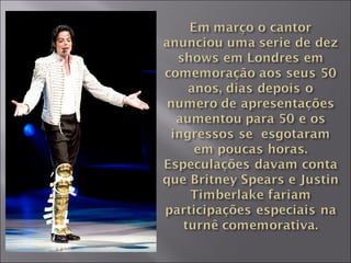 Michael Jackson nasceu em 1958 e se tornou um ícone da música pop como vocalista do The Jackson 5 e em sua carreira solo, que incluiu o álbum mais vendido de todos os tempos, Thriller. Sua vida e carreira foram marcadas por grandes sucessos, shows e polêmicas, até sua morte prematura em 2009 aos 50 anos.