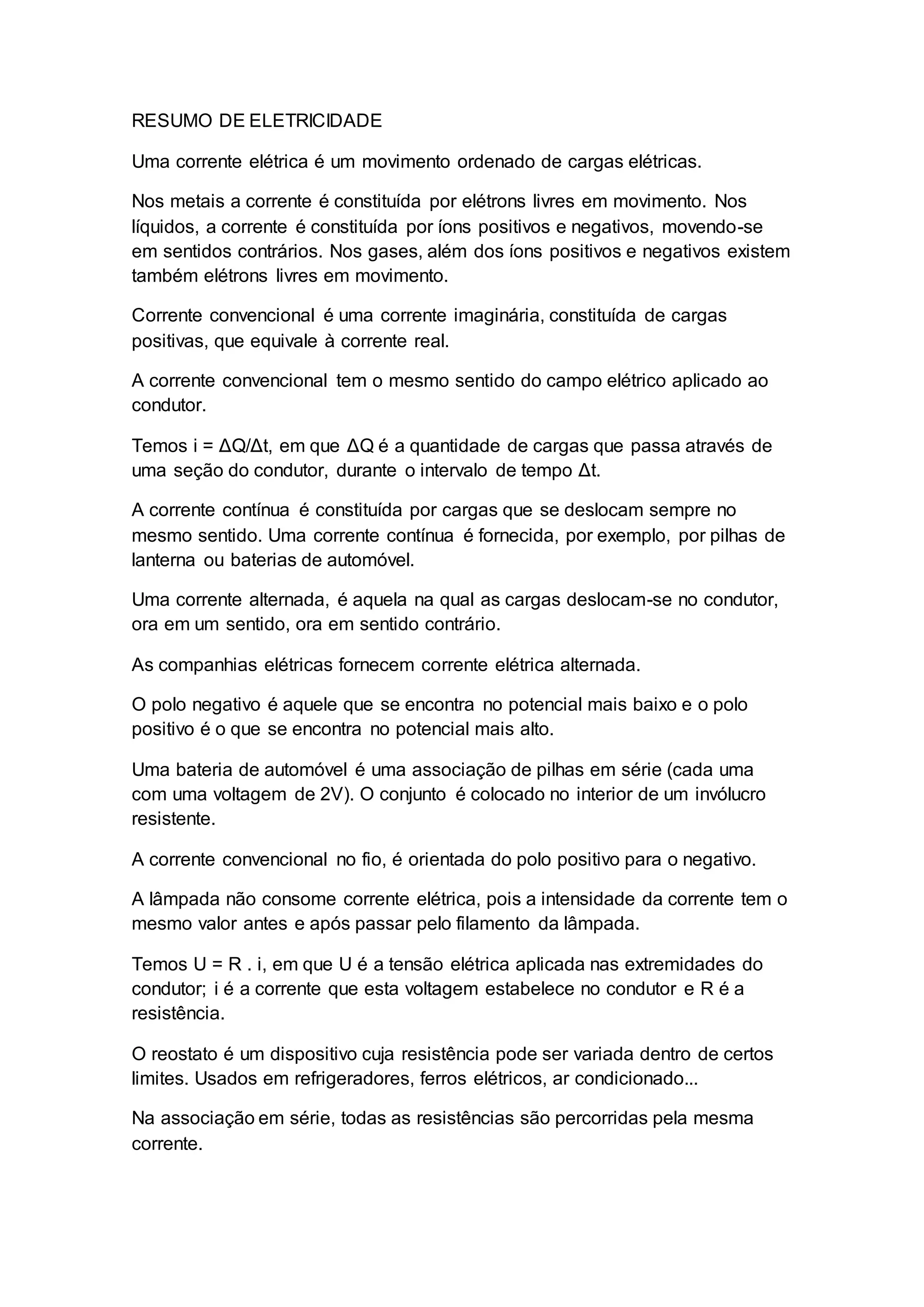 Este documento resume conceitos básicos de eletricidade e magnetismo. Ele explica que uma corrente elétrica é o movimento ordenado de cargas elétricas e que pode ser contínua ou alternada. Também descreve que um ímã natural possui polos norte e sul e que a Terra se comporta como um grande ímã.