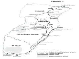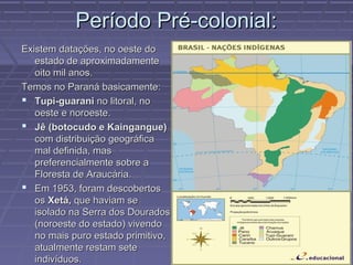 O documento resume a história do estado do Paraná no Brasil. Começa com a pré-história dos povos indígenas que habitaram a região, como os Tupi-Guarani e Jê. Depois aborda a chegada dos europeus no século XVI, principalmente os espanhóis e portugueses, e a fundação das primeiras vilas. O documento também descreve os principais ciclos econômicos do Paraná, como o do mate, madeira e café, além de conflitos como a Revolução Federalista e a Guerra do