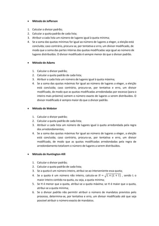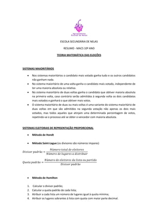 O documento descreve vários sistemas eleitorais, incluindo sistemas maioritários onde o candidato mais votado ganha, e sistemas de representação proporcional onde os assentos são distribuídos de forma proporcional aos votos recebidos por cada partido. Também apresenta métodos posicionais onde os eleitores ordenam os candidatos por preferência.