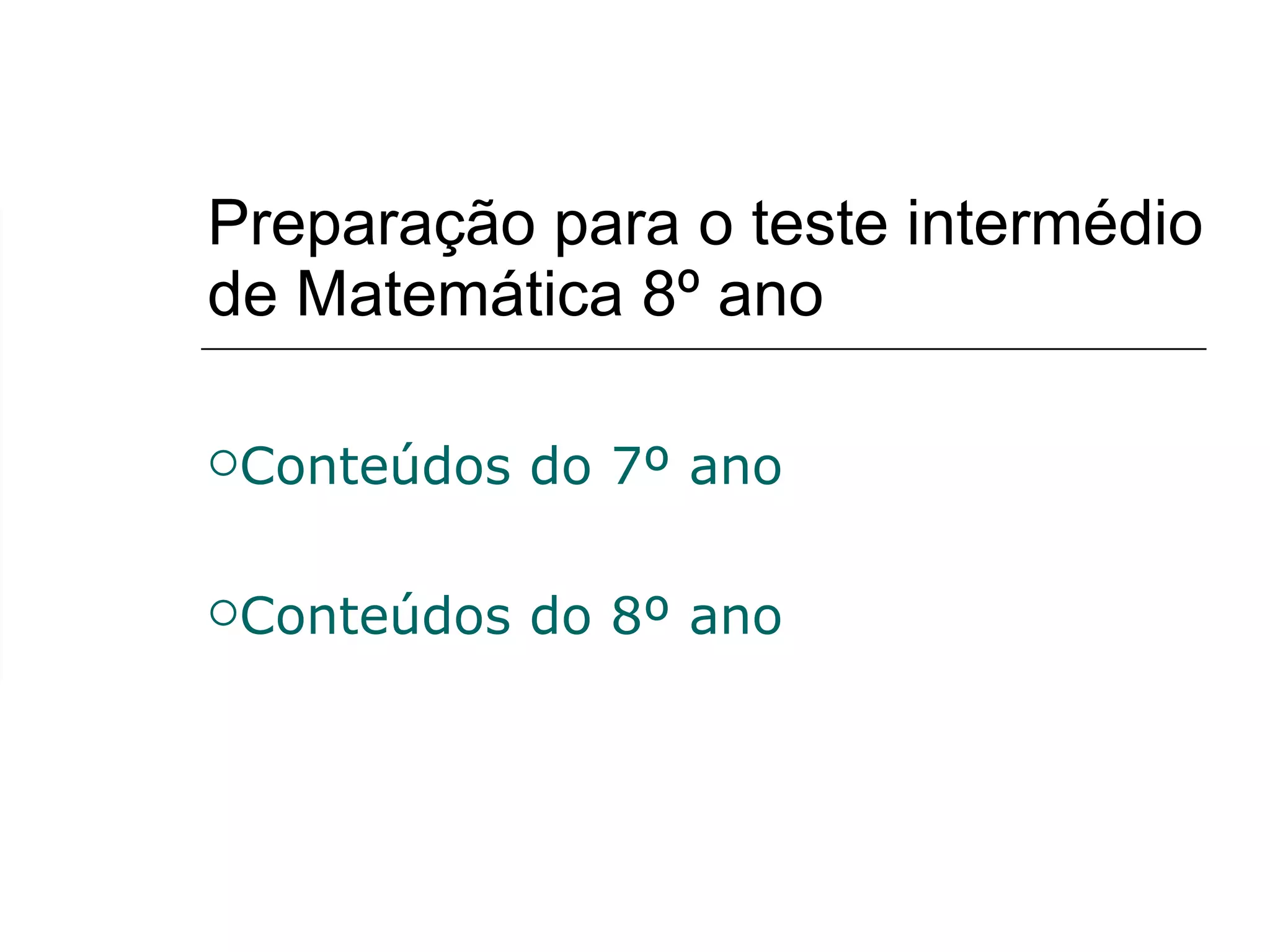 1) O documento resume os principais conteúdos de Matemática do 7o e 8o ano, incluindo teorema de Pitágoras, funções, semelhança de triângulos e estatística.