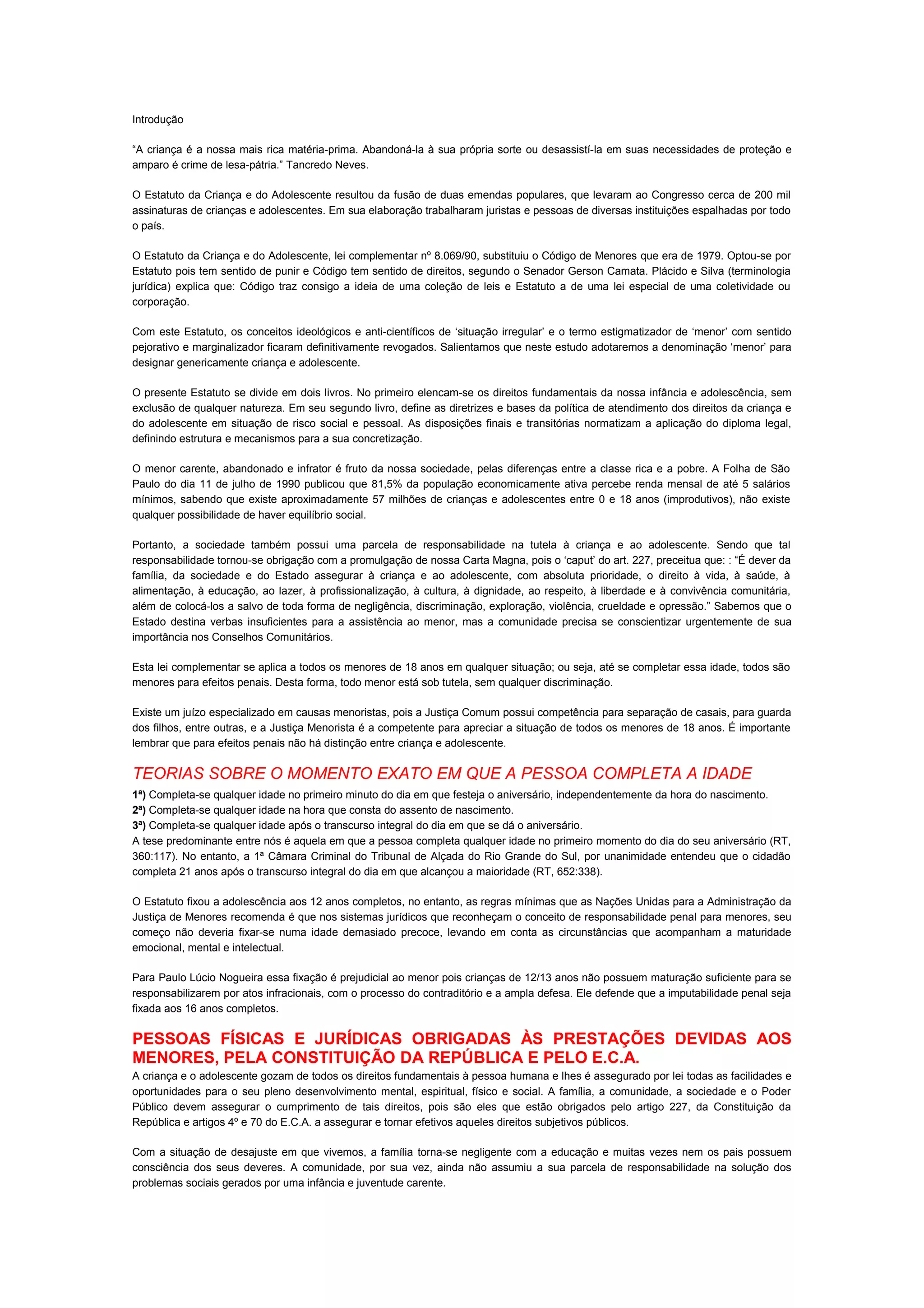 1) O documento discute o Estatuto da Criança e do Adolescente no Brasil, que substituiu o antigo Código de Menores em 1990. 2) Ele estabelece os direitos fundamentais de crianças e adolescentes e define as diretrizes para a proteção daqueles em situação de risco. 3) Os principais princípios do ECA incluem a prevalência dos interesses da criança, atendimento integral de seus direitos e a garantia prioritária de proteção e recursos.