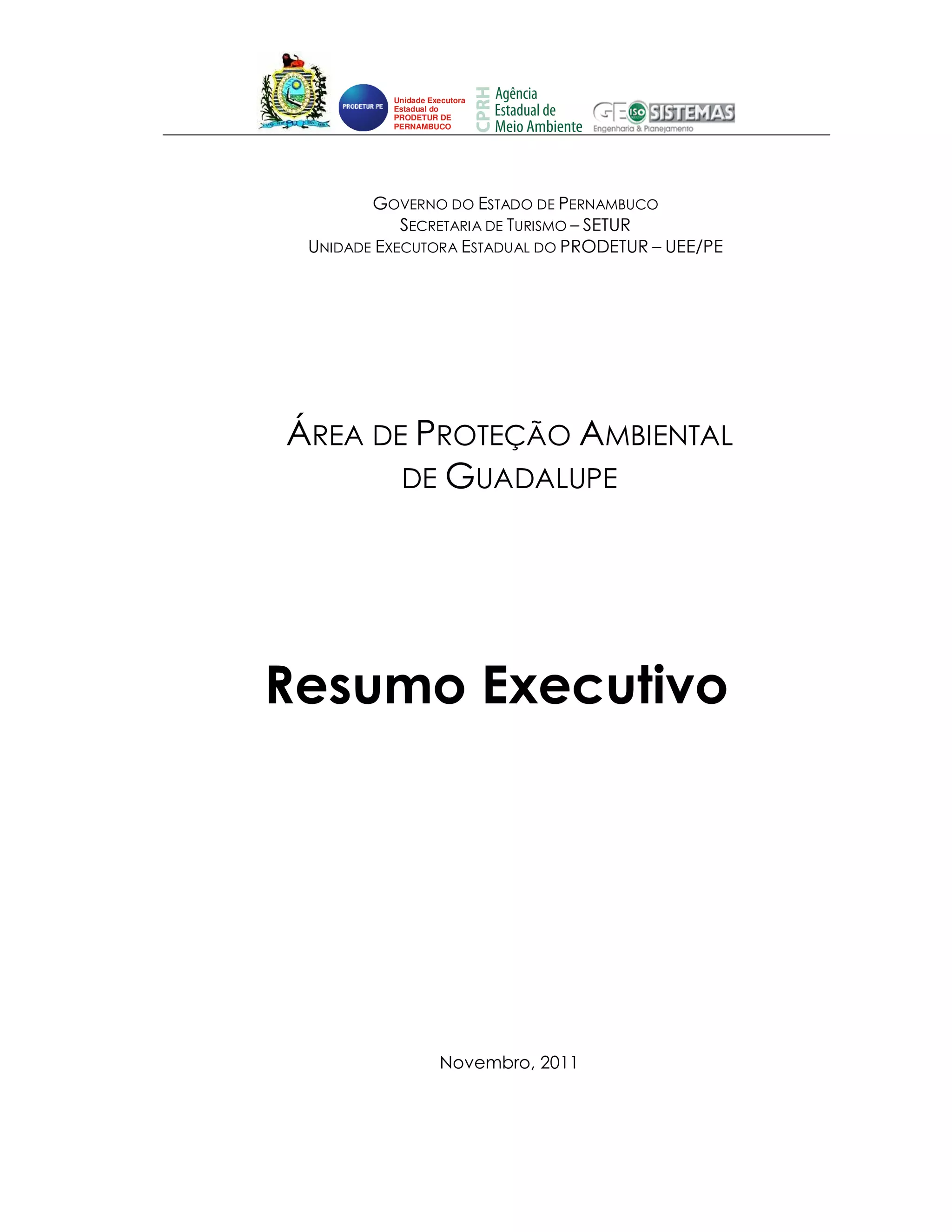 Este documento resume a Área de Proteção Ambiental de Guadalupe em Pernambuco. A APA foi criada em 1997 para proteger os ecossistemas locais, incluindo florestas, restingas, manguezais e recursos hídricos. O documento descreve a biodiversidade da região, incluindo fragmentos florestais, aves e fauna aquática. Ele também discute o zoneamento da APA, que define zonas para diferentes usos como conservação, turismo sustentável e agricultura.