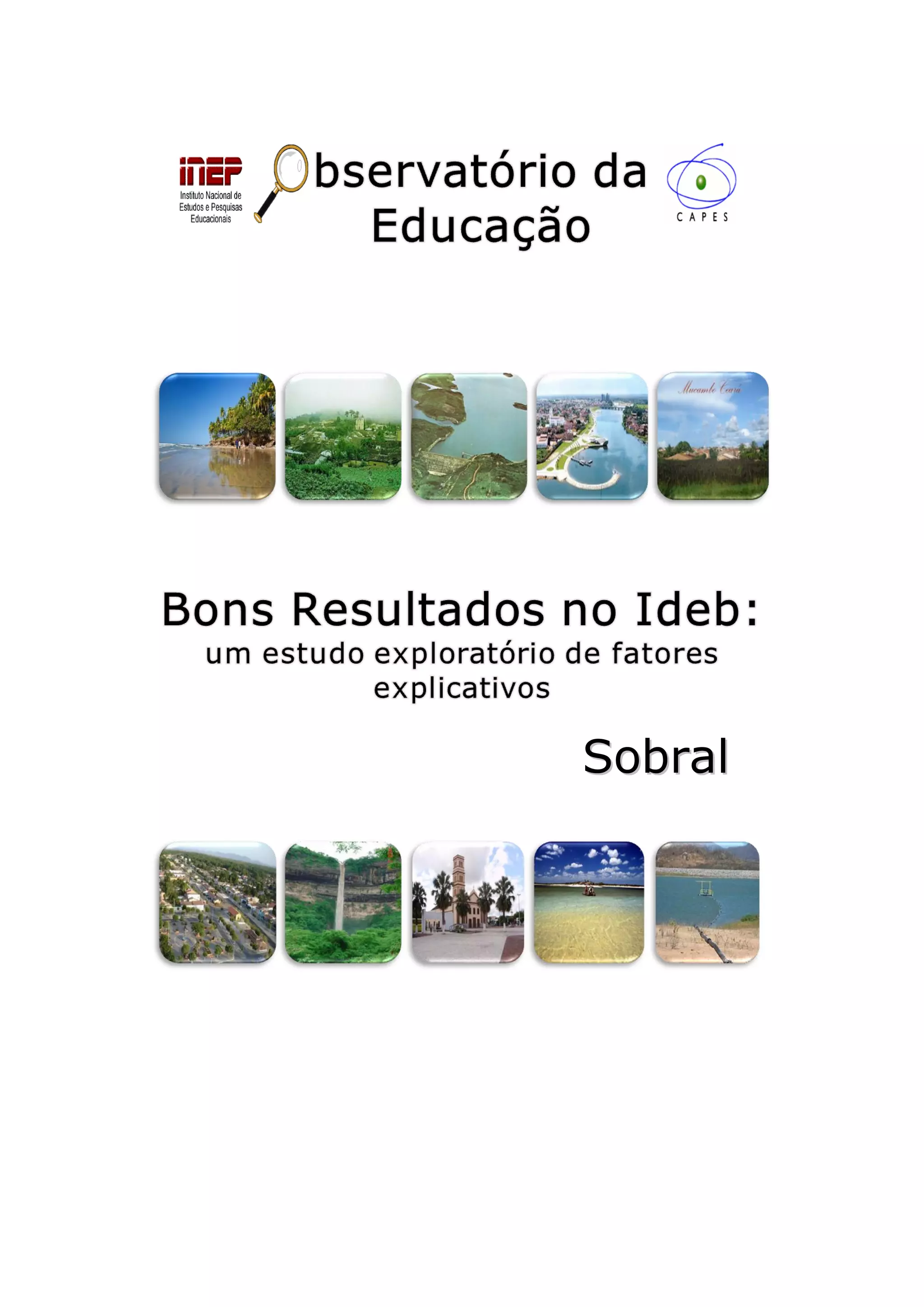 O documento apresenta os resultados de uma pesquisa sobre fatores explicativos dos bons resultados no IDEB em dez municípios brasileiros, incluindo Sobral no Ceará. Resume os principais indicadores socioeconômicos e educacionais de Sobral, destacando seu foco na aprendizagem e alfabetização, formação de professores, autonomia escolar e monitoramento de resultados.