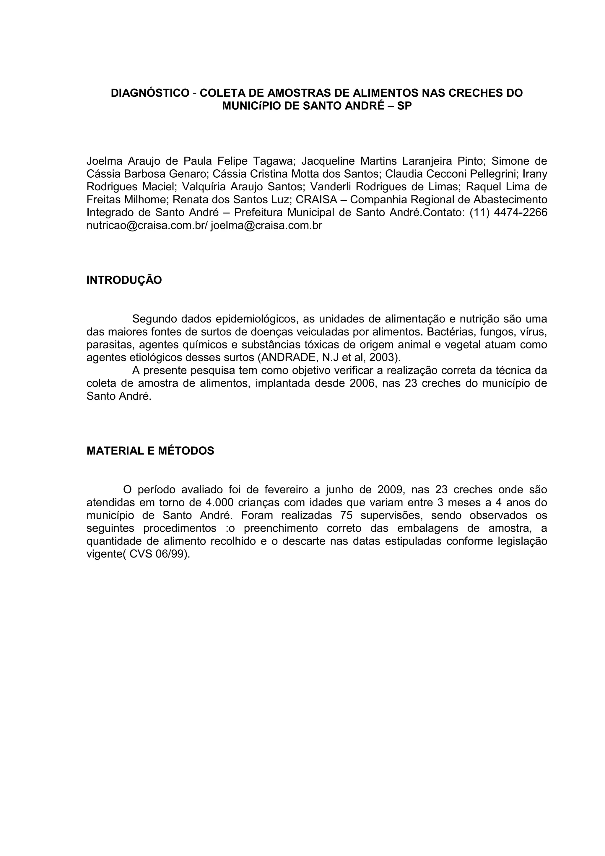 O documento descreve uma pesquisa que avaliou a coleta de amostras de alimentos em 23 creches de Santo André entre fevereiro e junho de 2009. A pesquisa observou que em 50% das visitas a coleta era realizada corretamente, enquanto nas outras 50% não era realizada, principalmente por esquecimento ou falta de equipamentos. As creches receberam orientações para melhorar os procedimentos de coleta de acordo com a legislação.