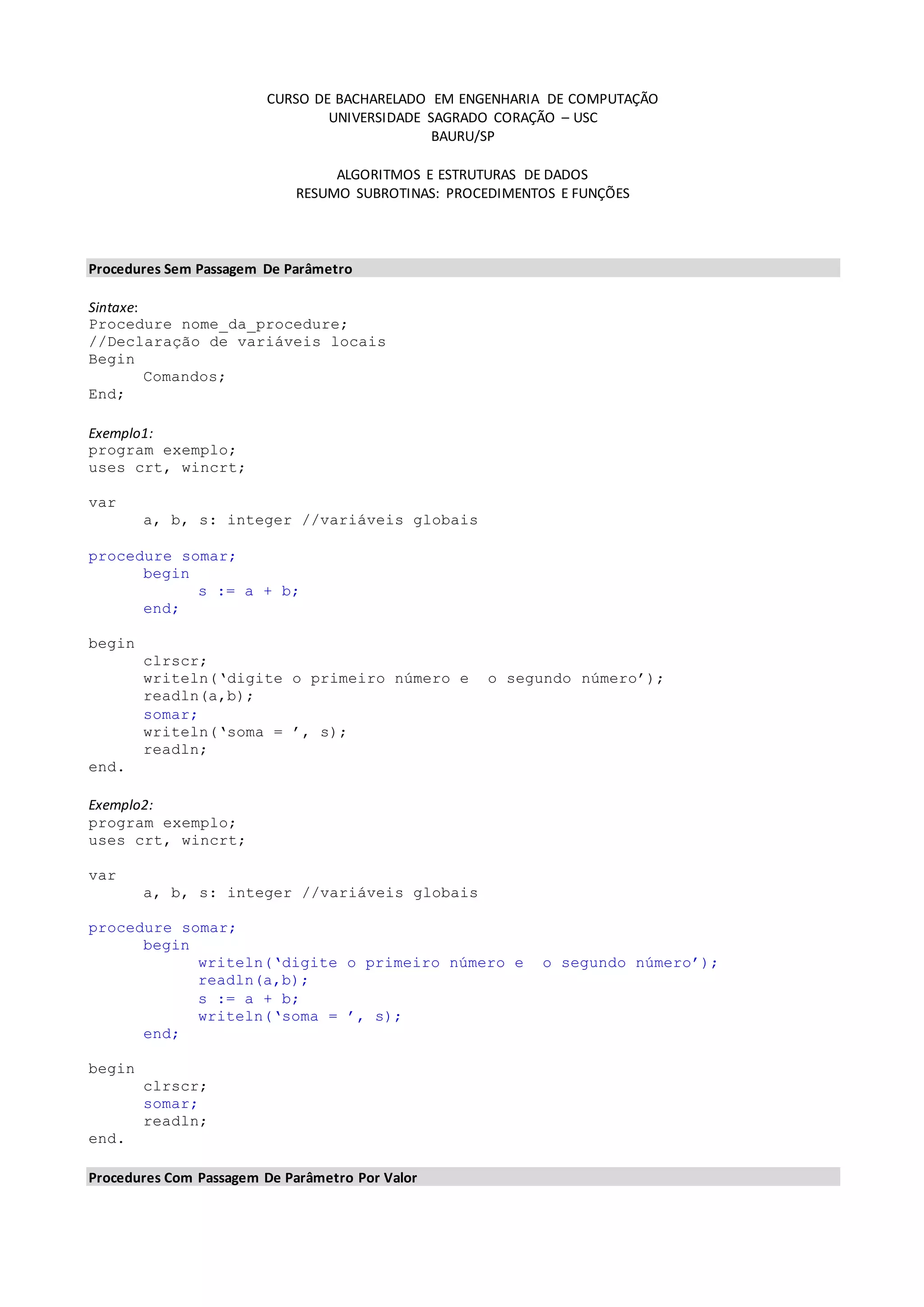 O documento explica as diferenças entre procedimentos e funções em Pascal, incluindo sintaxes e exemplos de como declarar e usar procedimentos e funções com e sem parâmetros, e como passar parâmetros por valor ou referência.