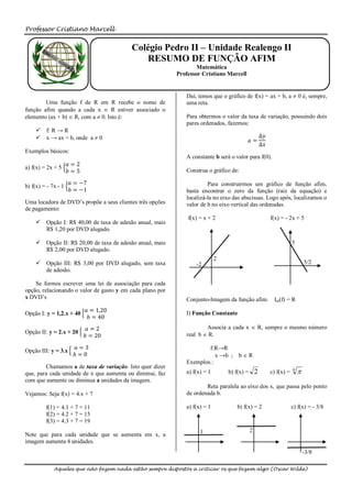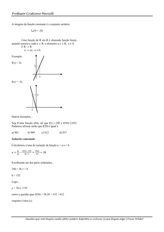 1) O documento descreve funções afins, que relacionam uma variável x a outra variável y através da equação y = ax + b, onde a ≠ 0.