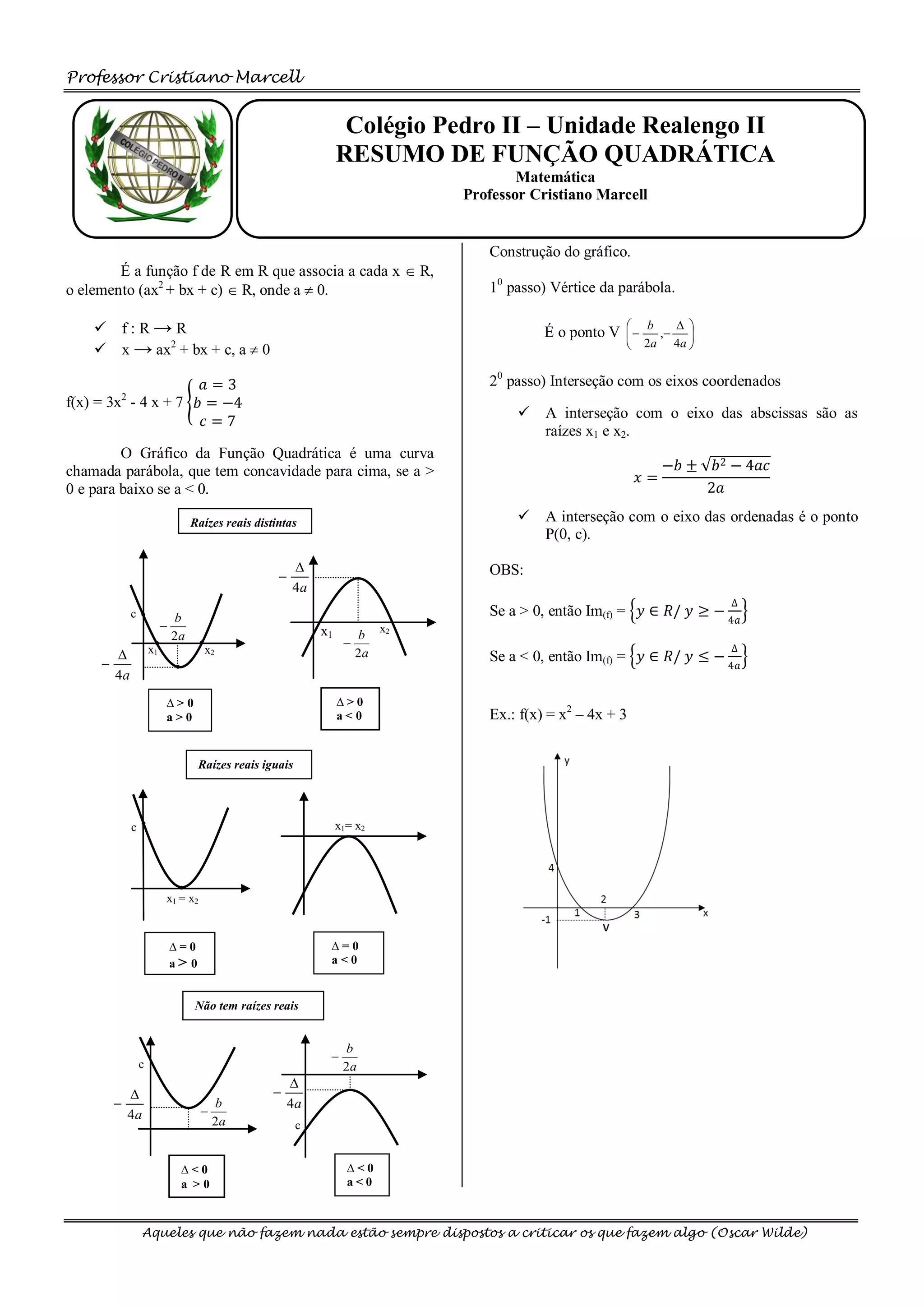 3) Também mostra como calcular as raízes da função quadrática e sua imagem, dependendo se a é positiva ou negativa.