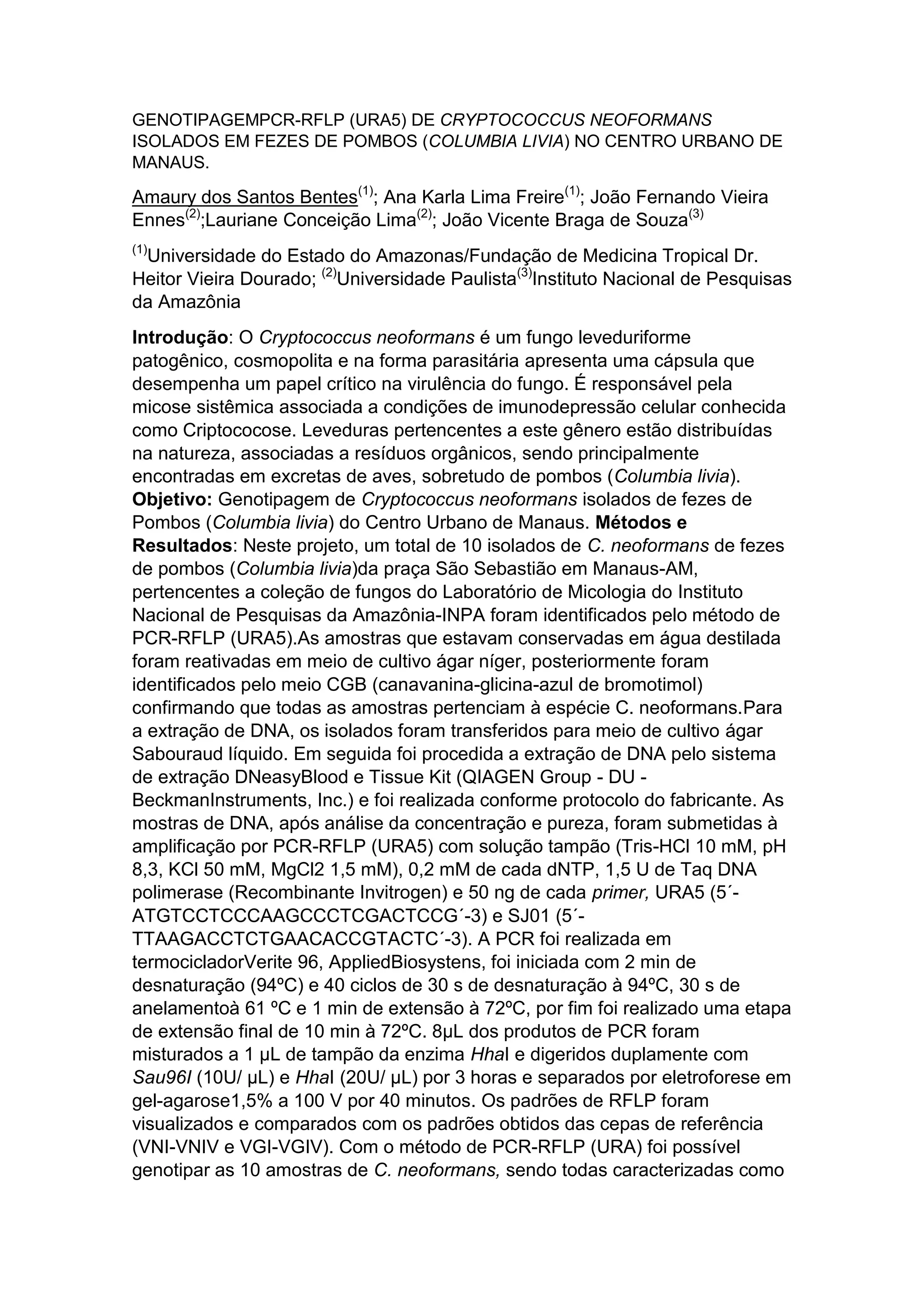 Genotipagem de 10 isolados de Cryptococcus neoformans encontrados em fezes de pombos na cidade de Manaus, Brasil. Todos os isolados foram identificados como genótipo VNI através do método de PCR-RFLP (URA5), que se mostrou eficaz para caracterizar isolados ambientais deste fungo patogênico. Os resultados fornecem informações úteis para estudos epidemiológicos sobre as fontes de infecção por C. neoformans na região.