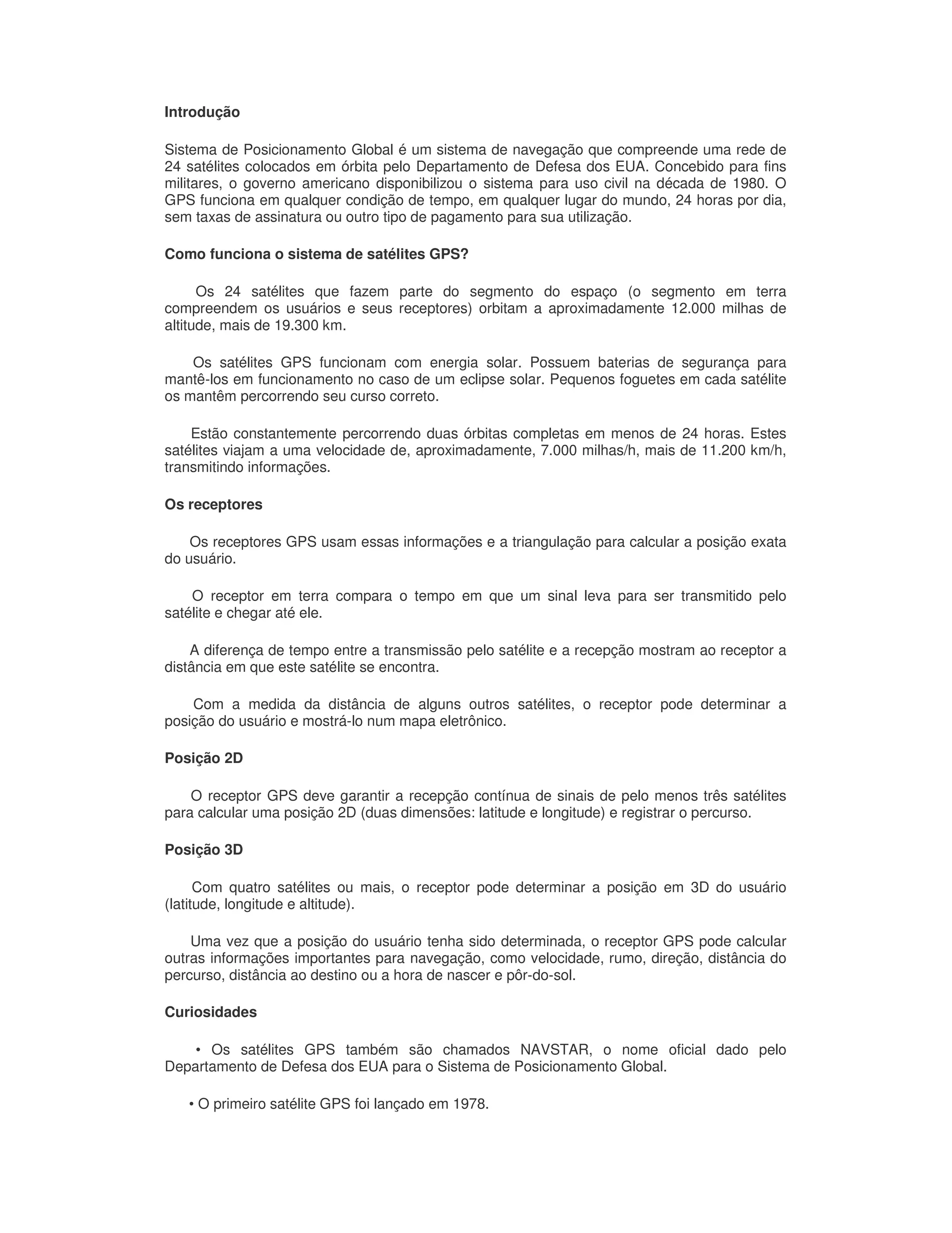 O documento descreve o sistema de posicionamento global (GPS), composto por 24 satélites que orbitam a Terra e transmitem sinais de rádio. Os receptores GPS usam esses sinais para calcular a posição do usuário através da triangulação. O GPS funciona em qualquer lugar do mundo e permite determinar a localização em duas ou três dimensões.