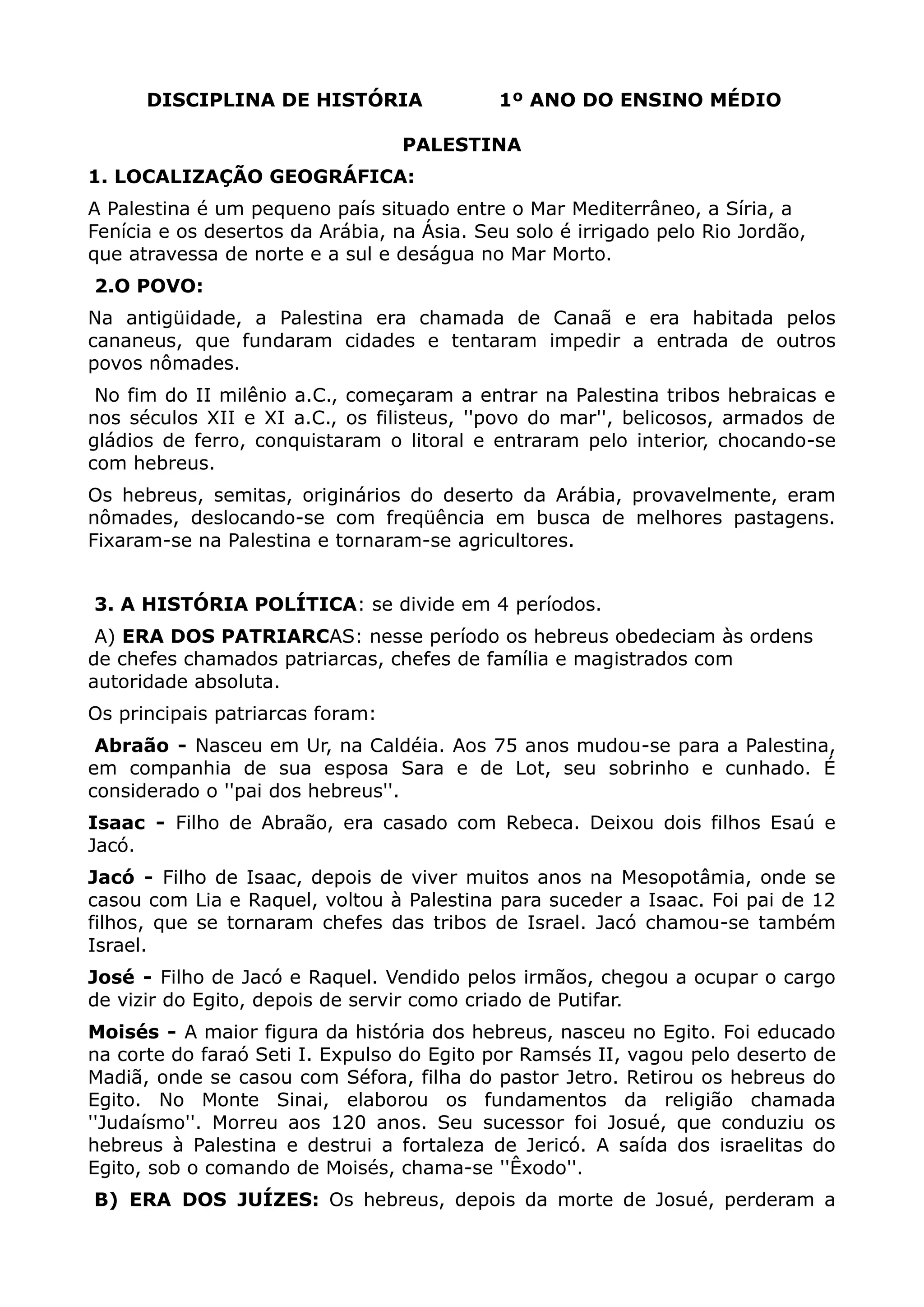 O documento resume a história da Palestina em 10 seções, cobrindo sua localização geográfica, povos antigos, períodos políticos como a era dos patriarcas, juízes e reis, a diáspora hebraica, organização política e social, religião com o judaísmo, economia baseada na agricultura, literatura e legado do monoteísmo e a Bíblia.
