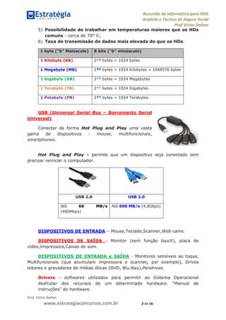 O documento fornece informações sobre conceitos básicos de informática, incluindo hardware, software, componentes de um computador como placa-mãe e CPU. Também discute memórias e dispositivos de armazenamento, redes e internet, navegadores, correio eletrônico e sistemas operacionais Windows.