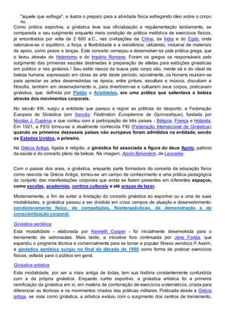A ginástica é uma forma de exercício físico com modalidades competitivas e não competitivas, originada na Grécia antiga, onde era praticada para fortalecimento físico e mental. O texto descreve várias categorias, como ginástica artística e rítmica, e sua evolução ao longo da história, incluindo a regulamentação em entidades dedicadas. Atualmente, a ginástica é reconhecida em diversos contextos, abrangendo desde competições até práticas voltadas para a saúde e educação física.