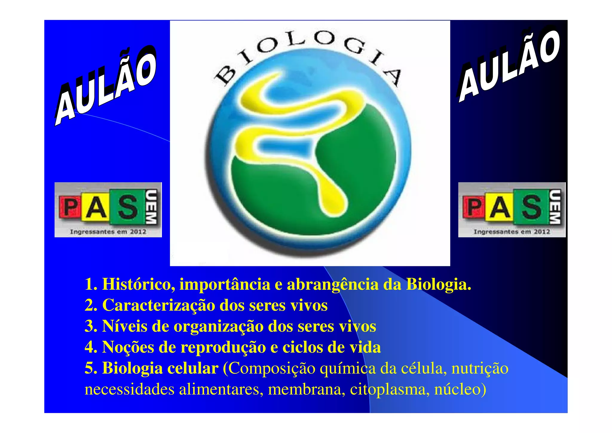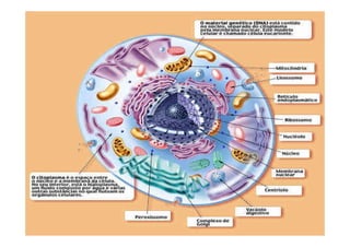 1. O documento discute os principais tópicos de biologia celular, incluindo a composição química da célula, estrutura e função das biomoléculas, metabolismo celular e replicação do material genético.