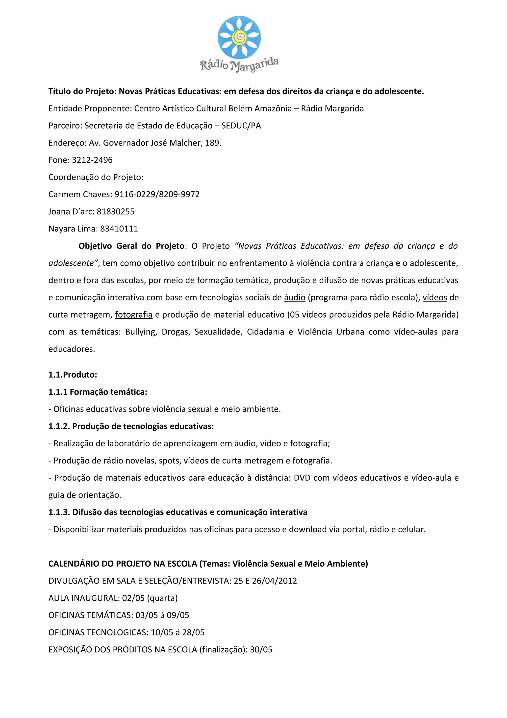 O projeto visa combater a violência contra crianças e adolescentes por meio de oficinas educativas, produção de conteúdos em áudio, vídeo e fotografia, e disponibilização desses materiais na internet e rádio para promover novas práticas pedagógicas.