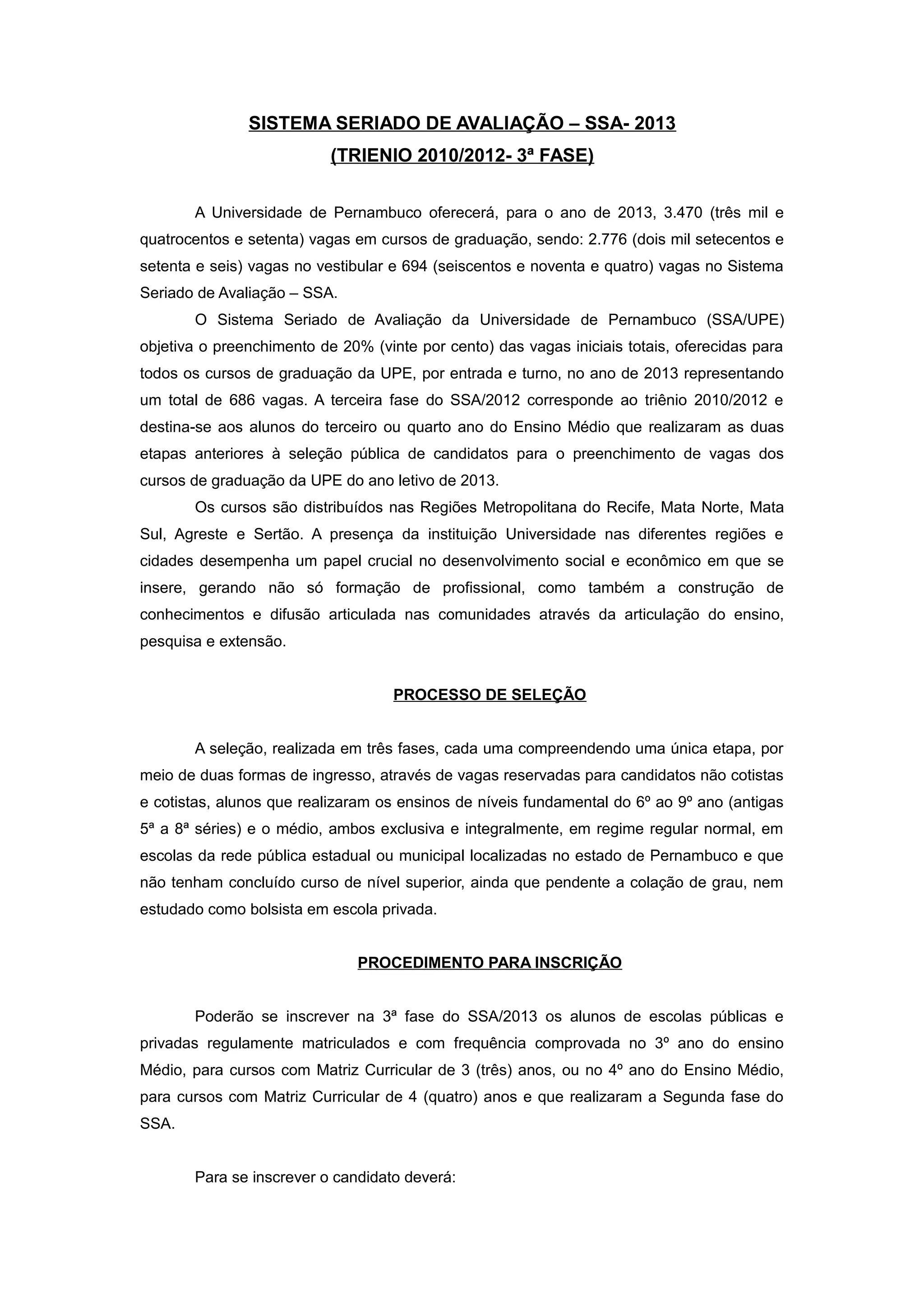 O documento descreve o Sistema Seriado de Avaliação (SSA) oferecido pela Universidade de Pernambuco em 2013, fornecendo detalhes sobre o processo de seleção e inscrição. Serão oferecidas 3.470 vagas em graduação, sendo 694 vagas no SSA. O SSA destina-se a alunos do 3o ou 4o ano do ensino médio que realizaram as duas fases anteriores. O documento explica os procedimentos e critérios para inscrição, isenção da taxa e sistema de cotas