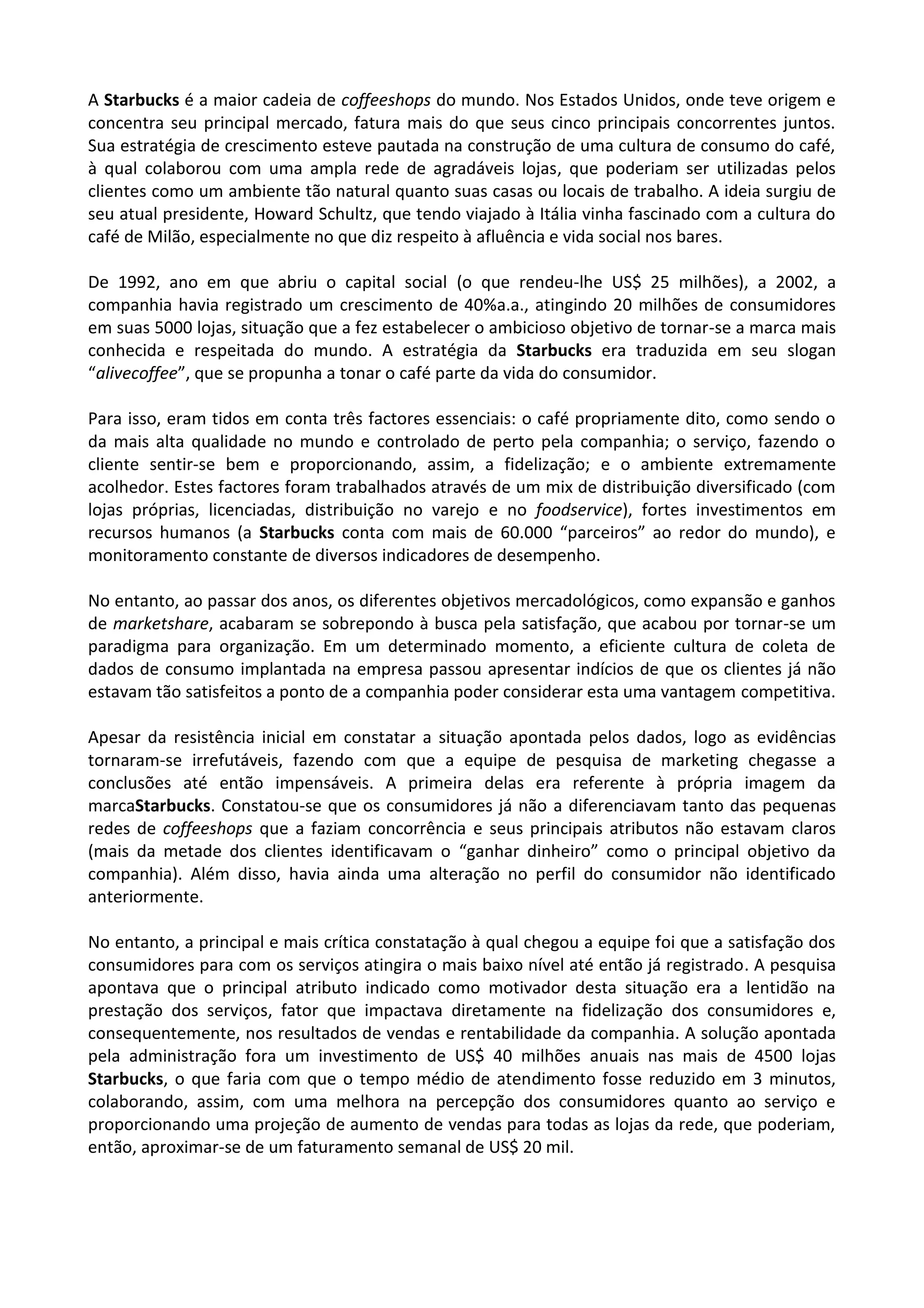 A Starbucks cresceu rapidamente nos anos 90 e 2000, mas pesquisas recentes mostraram que os clientes estavam menos satisfeitos, principalmente devido aos longos tempos de espera. A empresa investiu $40 milhões por ano para reduzir o tempo médio de atendimento em 3 minutos e melhorar a percepção dos clientes sobre o serviço.