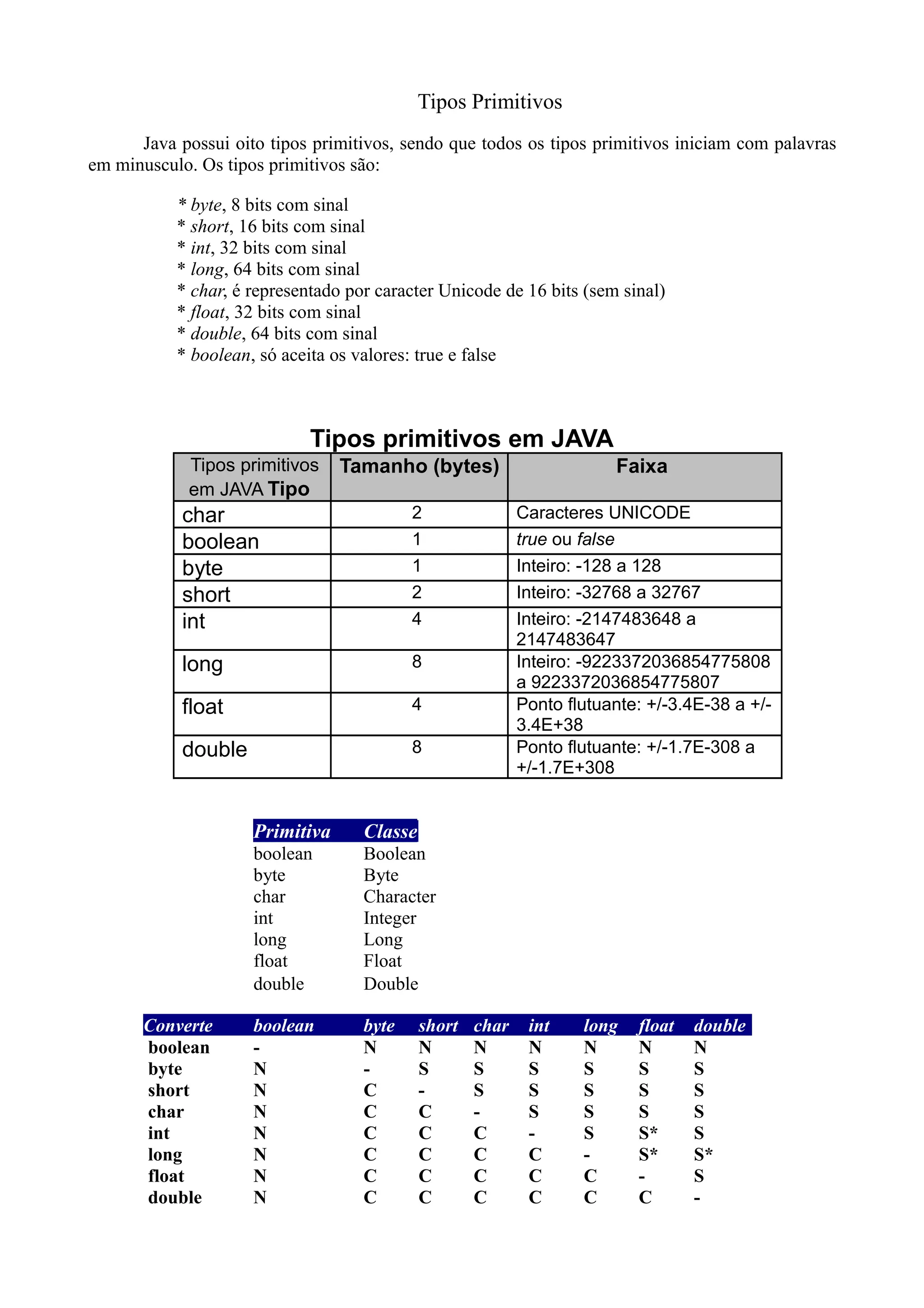 O documento descreve os tipos primitivos em Java, incluindo seus tamanhos e faixas de valores. Também discute literais, conversões entre tipos, operadores aritméticos e bitwise.