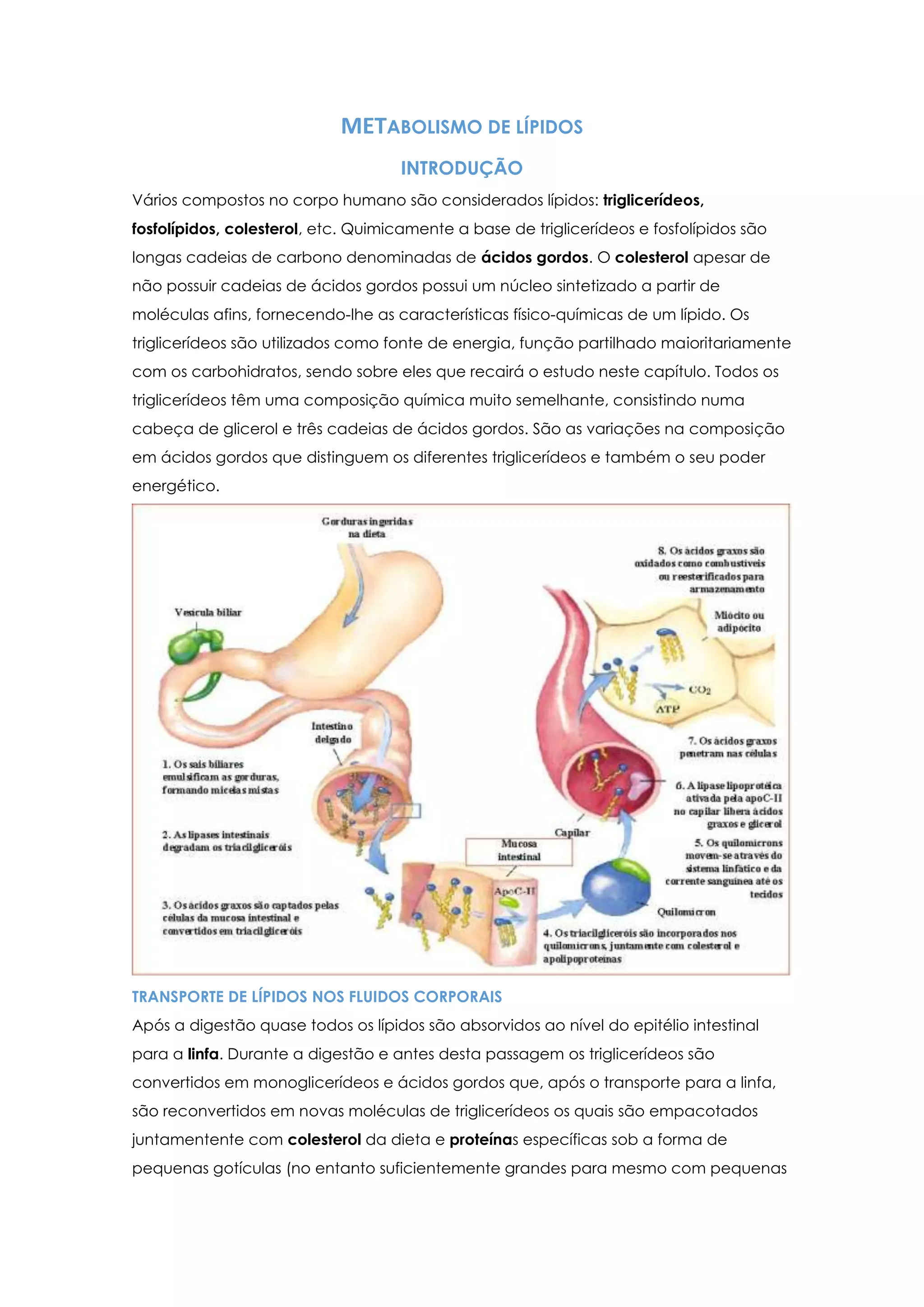 O documento descreve o metabolismo de lípidos no corpo humano, incluindo a digestão, transporte e armazenamento de triglicerídeos e outros lípidos. Explica que os triglicerídeos são transportados na corrente sanguínea através de quilomicrons e lipoproteínas e armazenados principalmente no fígado e tecido adiposo. Também descreve como os triglicerídeos podem ser utilizados como fonte de energia através da oxidação de ácidos gordos.