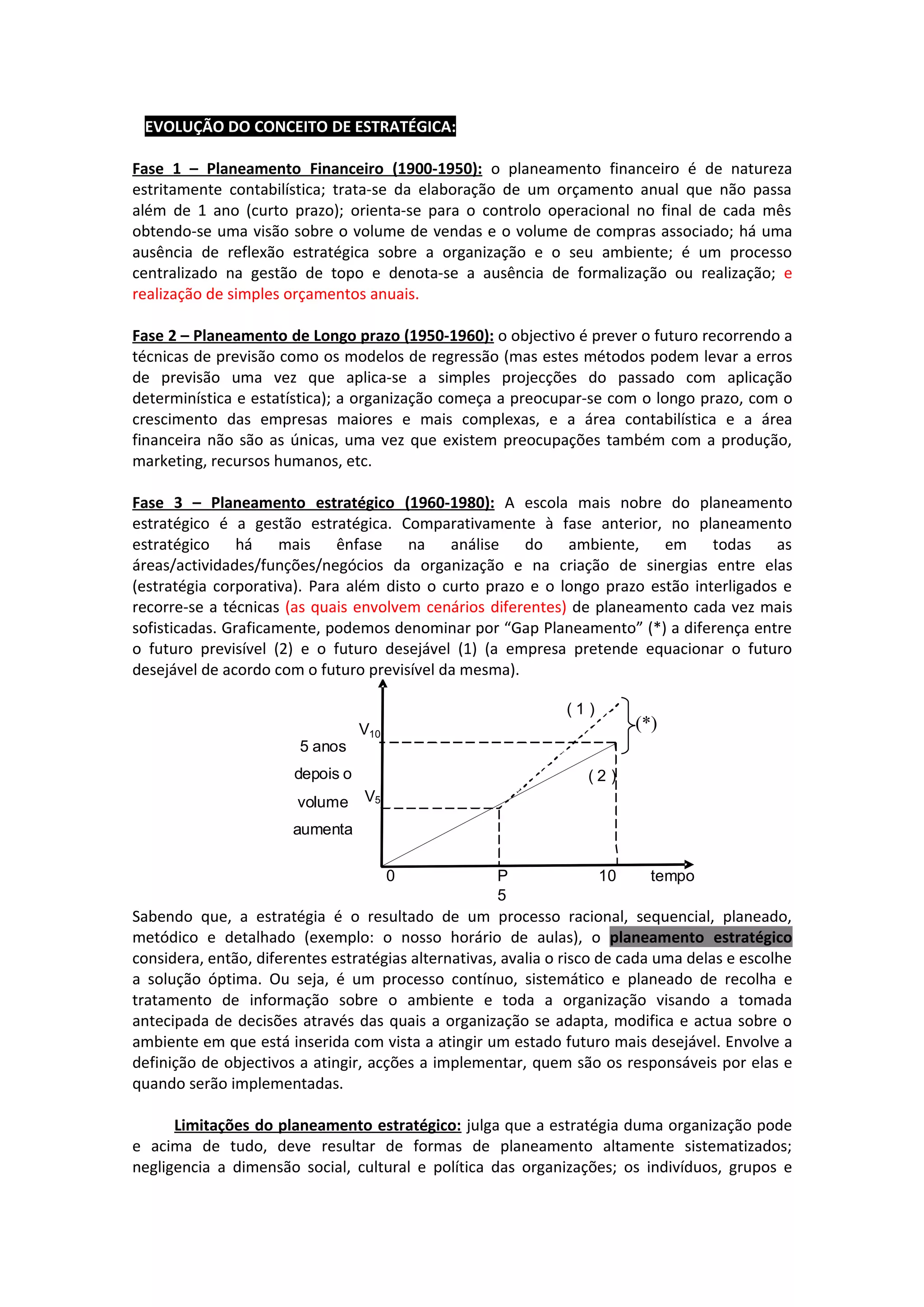 1) O documento descreve a evolução do conceito de estratégia empresarial ao longo de quatro fases, desde o planeamento financeiro no início do século XX até à gestão estratégica nos dias de hoje.