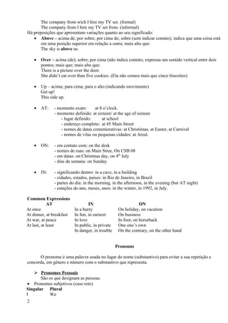 Este documento resume as principais preposições em inglês e seus significados, além de explicar os diferentes tipos de pronomes em inglês, incluindo pessoais, possessivos, indefinidos, relativos, interrogativos e demonstrativos.