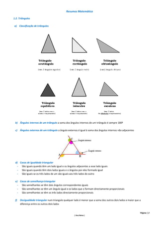 O documento resume conceitos fundamentais de geometria como classificação de ângulos e triângulos, propriedades de polígonos, circunferências e círculos, e isometrias. Aborda tópicos como a soma dos ângulos internos de um triângulo, casos de igualdade e semelhança triangular, ângulos ao centro e inscritos, e características de rotações, translações e eixos de simetria.
