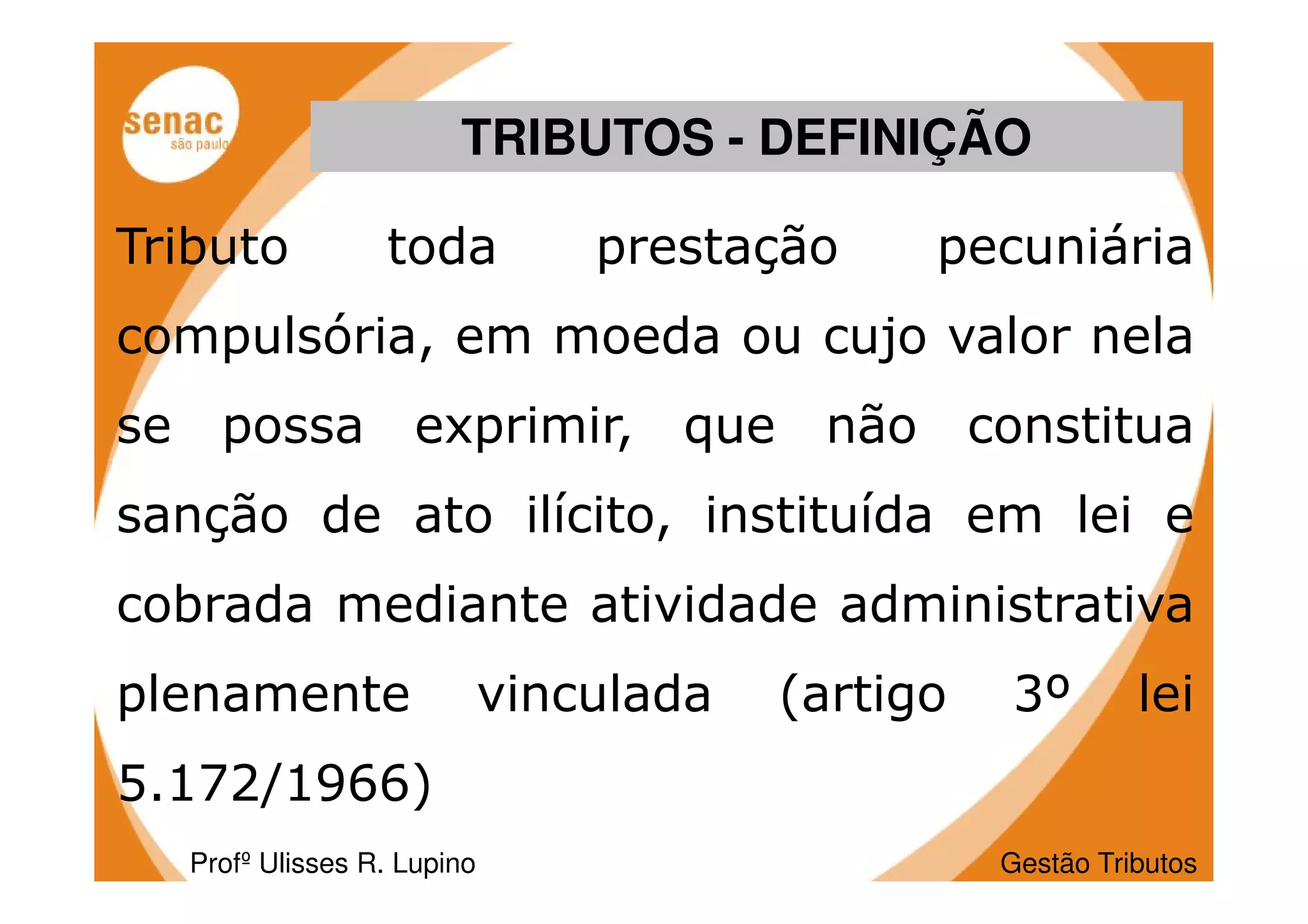 O documento define tributo como qualquer prestação pecuniária compulsória instituída em lei e cobrada pelo governo. Ele discute os principais elementos dos tributos como fato gerador, sujeito ativo e passivo, base de cálculo e alíquota. Além disso, lista os principais tipos de tributos no Brasil e explica as contribuições sociais e imposto de renda retido na fonte.