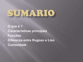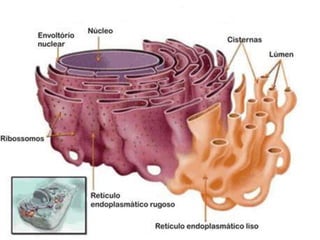 O documento descreve o retículo endoplasmático, uma organela presente nas células eucariontes. Ele é formado por túbulos e vesículas que se conectam ao envelope nuclear e participam da síntese e transporte de proteínas e lipídios. Existem dois tipos: o liso, que produz hormônios e lipídios, e o rugoso, que sintetiza proteínas com a ajuda de ribossomos aderidos à sua membrana.