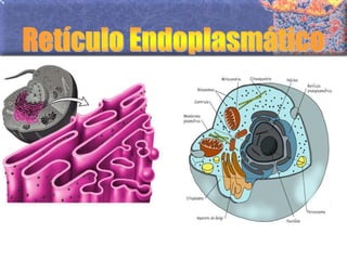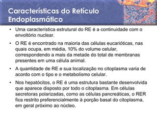 O documento descreve as características e funções do retículo endoplasmático. Ele discute a estrutura, composição e métodos de estudo do RE, além de detalhar os papéis do RE na síntese de proteínas e lipídios, e sua importância para o processamento de proteínas.