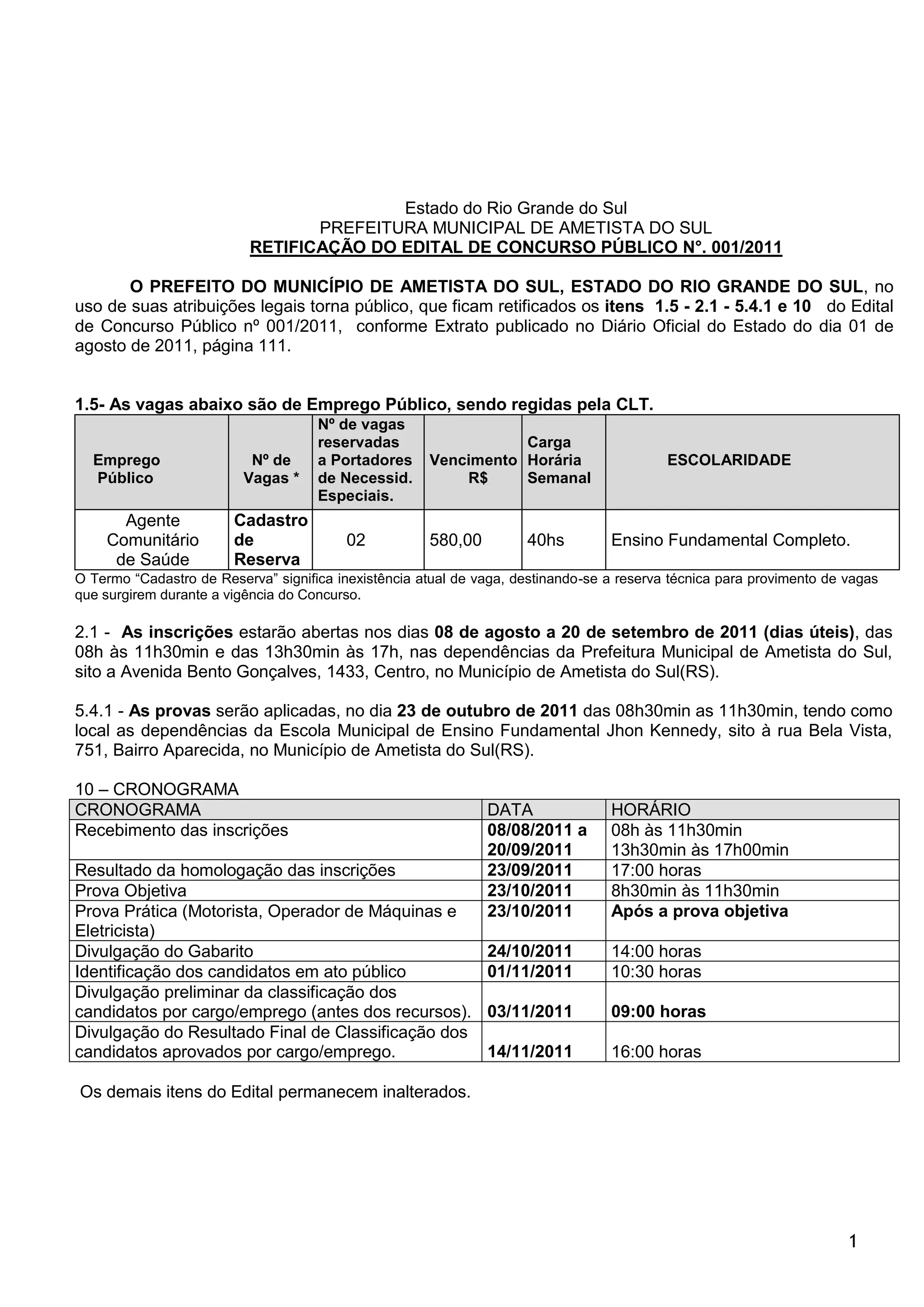 Este documento retifica itens do edital de concurso público no 001/2011 da Prefeitura Municipal de Ametista do Sul no Rio Grande do Sul. As alterações incluem o número de vagas, período de inscrição, local e data da prova objetiva e cronograma do concurso. Os demais itens permanecem inalterados.