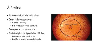 O documento descreve a anatomia e o funcionamento da retina humana. Resume as principais camadas e células da retina, incluindo bastonetes, cones, células ganglionares e como processam sinais visuais. Também explica como a retina se adapta à luz e escuro e transmite informações de cor para o cérebro.